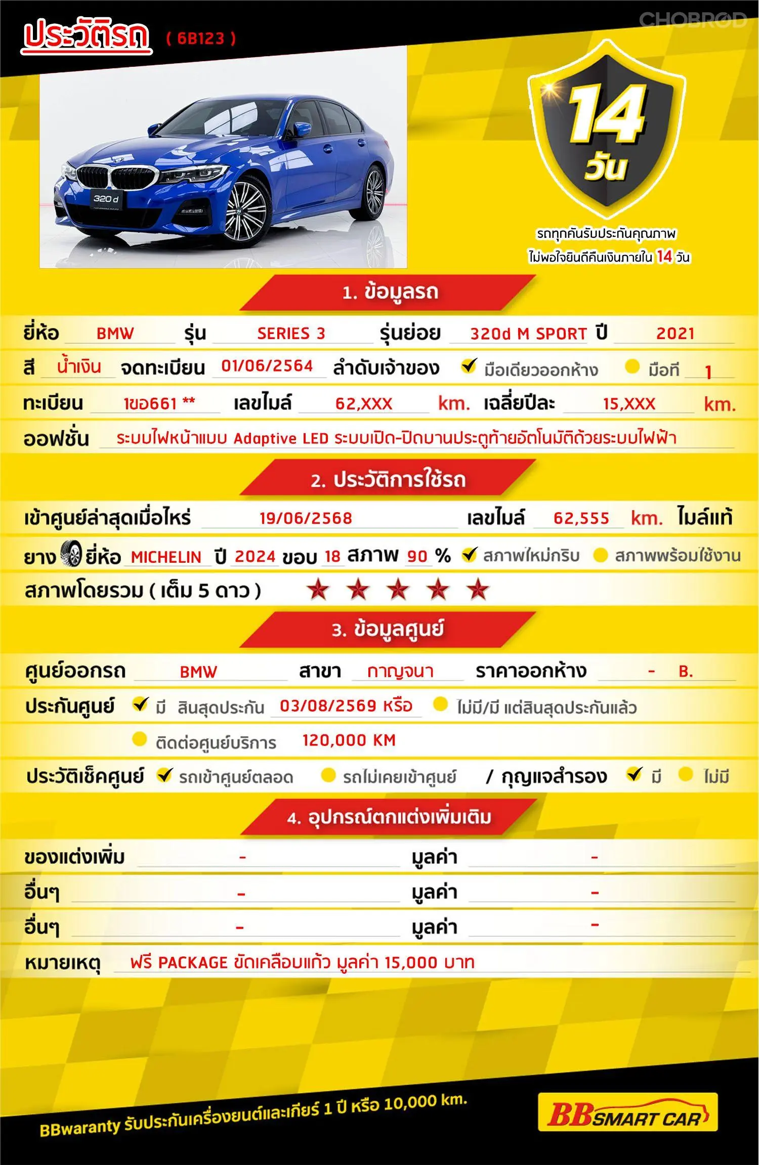 มีการรับประกันจากดีลเลอร์ (6 เดือน) มีบริการช่วยเหลือฉุกเฉินบนท้องถนน 24 ชม. จากดีลเลอร์