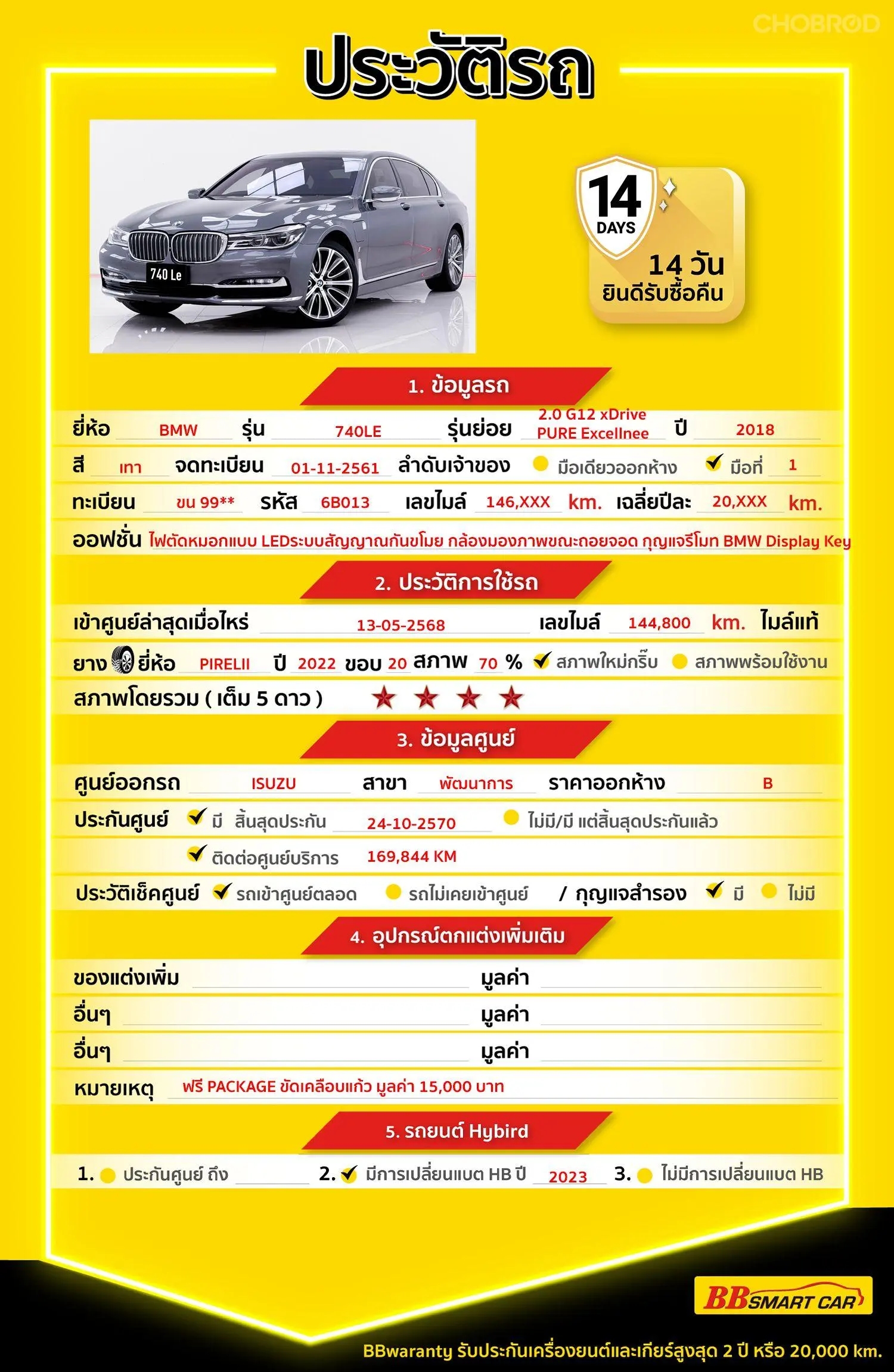 BMW SERIES 7 740 LE XDRUVE PURE EXCELLNEE G12 2018 ออกรถ 0 บาท จัดได้ 1,139,000 บ. Line:@*******แสดงข้อมูล 🔥จอง 199 บาท ส่งบัตรประชาชน รู้ผลพิจารณาภายใน 30 นาที ไม่ผ่านคืนเงินจองทุกกรณี 🔥ซื้อรถกับ BB พร้อมให้คำปรึกษา แก้ทุกปัญหา ให้ทุกเรื่อง บริการ call center 24 ชม. 🔥BB Care Plus รับประกันหลังการขาย สูงสุด 2 ปี หรือ 20,000 km.. 🔥มีรถให้เลือกมากกว่า 1,800 คัน สาขา 6 ศูนย์รวมรถยนต์ไอคาร์สยาม กาญจนาภิเษก รหัสรถ 6B013 ราคา 1,119,000 บาท ผ่อนเพียง 18,902 บาท Brand. : BMW Year. : 2018 Model. : SERIES 7 Grade. : 740 LE XDRUVE PURE EXCELLNEE G12 Engine. : 2,000 C Type. : เบนซิน,ระบบไฟฟ้า Gearbox : AT Color. : เทา Mileage. : 146,XXX KM. (ซื้อสด ราคานี้ยังไม่รวมค่าดำเนินการ 10,000 บ.) 🚩 Price. 1,119,000 บาท ยอดจัด : 1,129,000 บาท เงินดาวน์ : 0 บาท ประกันภัย : ฟรีประกันภัย 1 ปี ค่าดำเนินการ : 10,000 บาท รวมออกรถ : 0 บาท ผ่อน36 = 36,365 บาท ผ่อน48 = 27,976 บาท ผ่อน60 = 23,245 บาท ผ่อน72 = 20,794 บาท ผ่อน84 = 18,902 บาท เงื่อนไขเป็นไปตามที่ไฟแนนซ์กำหนด โปรโมชั่นพิเศษ สำหรับลูกค้าเครดิตดี 🚩เลือกรับเรทดอกเบี้ยพิเศษ 📍36 งวด = 1.29 % 📍48 งวด = 1.99 % 📍60 งวด = 2.39 % 📍72 งวด = 3.59 % 🔥 เงื่อนไข โปรโมชั่น ดอกเบี้ยเริ่มต้น 1.29% ตลอดอายุสัญญา - ยอดจัดไฟแนนซ์ 300,000-600,0000 บาท - ผ่อนสูงสุด 72 เดือน - เป็นลูกค้าประวัติดี พนักงานประจำเงินเดือน 20,000 ขึ้นไป - ค่าดำเนินการแคมเปญ 20,000 บาท (รวมในยอดจัดได้) 🎗Car Hightlight รถสวยๆ วันนี้ขอแนะนำ BMW SERIES 7 740 LE XDRUVE PURE EXCELLNEE G12 2018 ออฟชั่น 12.2.1 : ไฟตัดหมอกแบบ LED 12.2.2 : ไฟหน้า Adaptive LED Headlamp 12.2.3 : กระจกมองข้างฝั่งคนขับ แบบปรับลดแสงอัตโนมัติ 🎗ภายใน เบาะไฟฟ้าคู่หน้า เซ็นทรัลล๊อก กุญแจรีโมท-สัญญานกันขโมย จอ LCD เล่น DVD กระจกไฟฟ้า แอร์ AUTO เบรค ABS พวงมาลัยเพาเวอร์ กระจกมองข้างปรับไฟฟ้า Cruise Control พวงมาลัย Multifunction Airbag 🎗ภายนอก ไฟตัดหมอก ล้อแม็ก ไฟโปรเจคเตอร์ ไฟเลี้ยวกระจกมองข้าง 🎗ความคุ้มค่า สำหรับคันนี้หากเปรียบเทียบราคากับคุณภาพ คันนี้ถือว่าคุ้มค่ามากค่ะ ผ่อนสบายๆก็มีรถขับได้ รถดีมีคุณภาพแบบนี้รีบตัดสินใจซื้อได้เลราคานี้มาไวไปไวนะคะ ⭐️การรับประกันหลังการขาย BB Care Plus สูงสุด 2 ปี หรือ 20,000 km. ด้วยช่างที่ผ่านการอบรมจากศูนย์ชั้นนำของประเทศ 🎉🎉Special offer เฉพาะ บีบีสมาร์ทคาร์ ที่นี่ที่เดียว ⭐️ ดอกเบี้ยเริ่มต้น 1.29% มีไฟแนนซ์รองรับหลายที่ค่ะ ⭐️ ฟรี!! แพคเก็จ ขัดเคลือบแก้ว มูลค่า 15,000 บาท ทุกคัน ⭐️ อนุมัติไว 30 นาที นำเอกสารมาให้ครบรับรถกลับบ้านทันทีค่ะ ⭐️ BB Care Plus รับประกันหลังการขาย สูงสุด 2 ปี หรือ 20,000 km. ⭐️ มี 6 สาขา ในกรุงเทพและปริมณฑลใกล้บ้านท่าน ⭐️ รถทุกคันผ่านตรวจสอบ Inspection เรียบแล้วค่ะ ผ่าน 5 ดาวทุกคันค่ะ ⭐️ เซลล์ทุกท่านเป็นมืออาชีพพร้อมให้บริการทุกท่านแน่นอนค่ะ