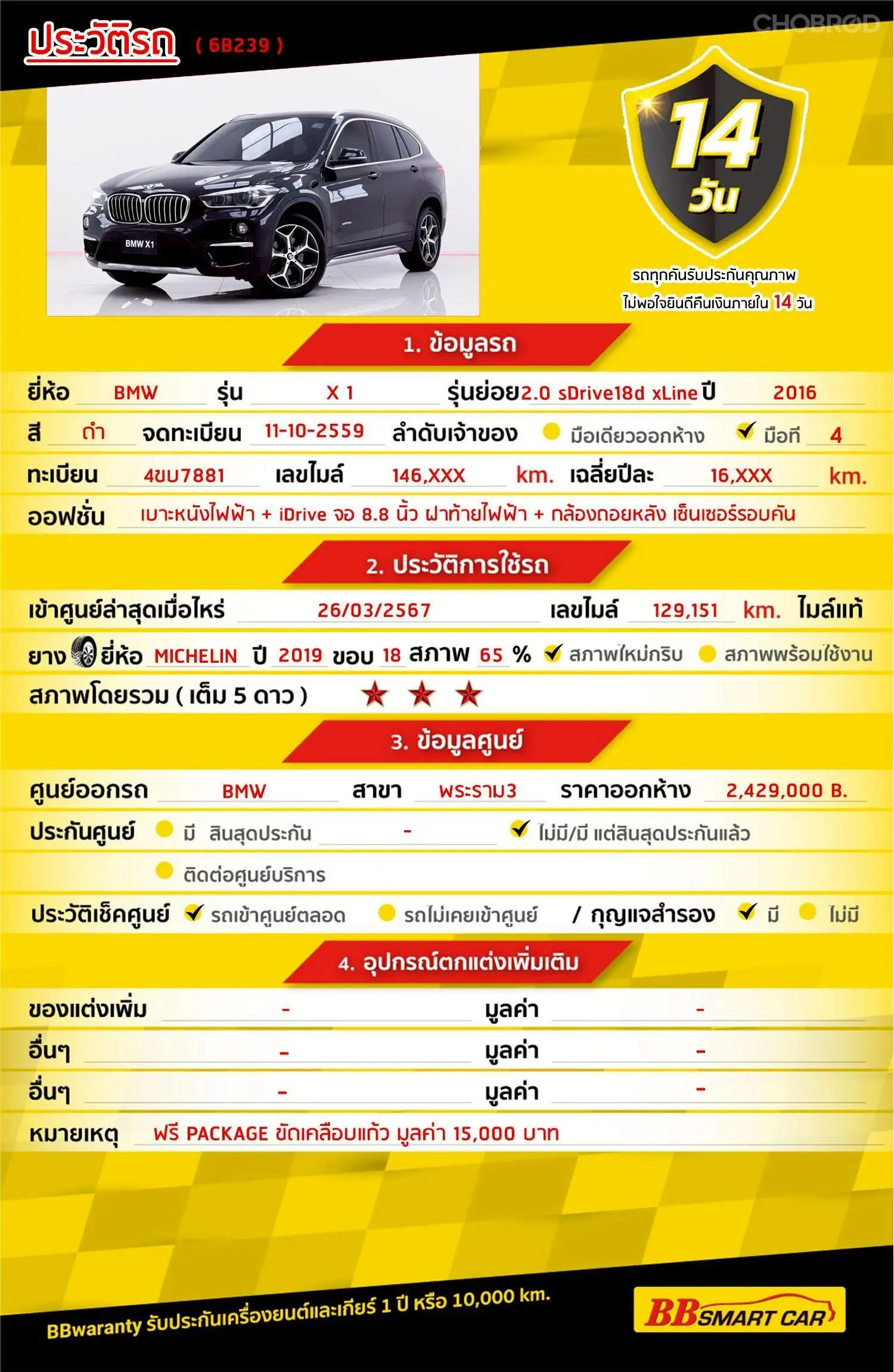 BMW X1 2.0 SDRIVE 18D XLINE F48 AT 2016 ออกรถ 0 บาท จัดได้ 719,000 บ. Line:@bbcar06 🔥จอง 199 บาท ส่งบัตรประชาชน รู้ผลพิจารณาภายใน 30 นาที ไม่ผ่านคืนเงินจองทุกกรณี 🔥ซื้อรถกับ BB พร้อมให้คำปรึกษา แก้ทุกปัญหา ให้ทุกเรื่อง บริการ call center 24 ชม. 🔥BB Care Plus รับประกันหลังการขาย สูงสุด 2 ปี หรือ 20,000 km.. 🔥มีรถให้เลือกมากกว่า 1,800 คัน สาขา 6 ศูนย์รวมรถยนต์ไอคาร์สยาม กาญจนาภิเษก รหัสรถ 6B239 ราคา 699,000 บาท ผ่อนเพียง 12,754 บาท Brand. : BMW Year. : 2016 Model. : X1 Grade. : 2.0 SDRIVE 18D XLINE F48 Engine. : 2,000 CC Type. : ดีเซล Gearbox : AT Color. : ดำ Mileage. : 146,xxx KM. (ซื้อสด ราคานี้ยังไม่รวมค่าดำเนินการ 10,000 บ.) 🚩 Price. 699,000 บาท ยอดจัด : 709,000 บาท เงินดาวน์ : 0 บาท ประกันภัย : ฟรีประกันภัย 1 ปี ค่าดำเนินการ : 10,000 บาท รวมออกรถ : 0 บาท ผ่อน 36 = 23,533 บาท ผ่อน 48 = 18,264 บาท ผ่อน 60 = 15,229 บาท ผ่อน 72 = 13,691 บาท ผ่อน 84 = 12,754 บาท เงื่อนไขเป็นไปตามที่ไฟแนนซ์กำหนด โปรโมชั่นพิเศษ สำหรับลูกค้าเครดิตดี 🚩เลือกรับเรทดอกเบี้ยพิเศษ 📍36 งวด = 1.29 % 📍48 งวด = 1.99 % 📍60 งวด = 2.39 % 📍72 งวด = 3.59 % 🔥 เงื่อนไข โปรโมชั่น ดอกเบี้ยเริ่มต้น 1.29% ตลอดอายุสัญญา - ยอดจัดไฟแนนซ์ 300,000-600,0000 บาท - ผ่อนสูงสุด 72 เดือน - เป็นลูกค้าประวัติดี พนักงานประจำเงินเดือน 20,000 ขึ้นไป - ค่าดำเนินการแคมเปญ 20,000 บาท (รวมในยอดจัดได้) 🎗Car Hightlight รถสวยๆ วันนี้ขอแนะนำ BMW X1 2.0 SDRIVE 18D XLINE F48 AT 2016 ออฟชั่น 12.2.1 :ฝาท้ายไฟฟ้า + กล้องถอยหลัง เซ็นเซอร์รอบคัน 12.2.2 :เครื่องยนต์ดีเซล 2.0 Turbo ประหยัด แรงบิดดี 12.2.3 : เบาะหนังไฟฟ้า + iDrive จอ 8.8 นิ้ว 🎗ภายใน เบาะไฟฟ้าคู่หน้า กระจกไฟฟ้า กระจกมองข้างปรับไฟฟ้า เซ็นทรัลล๊อก Cruise Control Airbag เบรค ABS พวงมาลัย Multifunction แอร์ AUTO จอ LCD เล่น DVD พวงมาลัยเพาเวอร์ 🎗ภายนอก ไฟเลี้ยวกระจกมองข้าง ล้อแม็ก ไฟตัดหมอก ไฟโปรเจคเตอร์ 🎗ความคุ้มค่า สำหรับคันนี้หากเปรียบเทียบราคากับคุณภาพ คันนี้ถือว่าคุ้มค่ามากค่ะ ผ่อนสบายๆก็มีรถขับได้ รถดีมีคุณภาพแบบนี้รีบตัดสินใจซื้อได้เลราคานี้มาไวไปไวนะคะ ⭐️การรับประกันหลังการขาย BB Care Plus สูงสุด 2 ปี หรือ 20,000 km. ด้วยช่างที่ผ่านการอบรมจากศูนย์ชั้นนำของประเทศ 🎉🎉Special offer เฉพาะ บีบีสมาร์ทคาร์ ที่นี่ที่เดียว ⭐️ ดอกเบี้ยเริ่มต้น 1.29% มีไฟแนนซ์รองรับหลายที่ค่ะ ⭐️ ฟรี!! แพคเก็จ ขัดเคลือบแก้ว มูลค่า 15,000 บาท ทุกคัน ⭐️ อนุมัติไว 30 นาที นำเอกสารมาให้ครบรับรถกลับบ้านทันทีค่ะ ⭐️ BB Care Plus รับประกันหลังการขาย สูงสุด 2 ปี หรือ 20,000 km. ⭐️ มี 6 สาขา ในกรุงเทพและปริมณฑลใกล้บ้านท่าน ⭐️ รถทุกคันผ่านตรวจสอบ Inspection เรียบแล้วค่ะ ผ่าน 5 ดาวทุกคันค่ะ ⭐️ เซลล์ทุกท่านเป็นมืออาชีพพร้อมให้บริการทุกท่านแน่นอนค่ะ