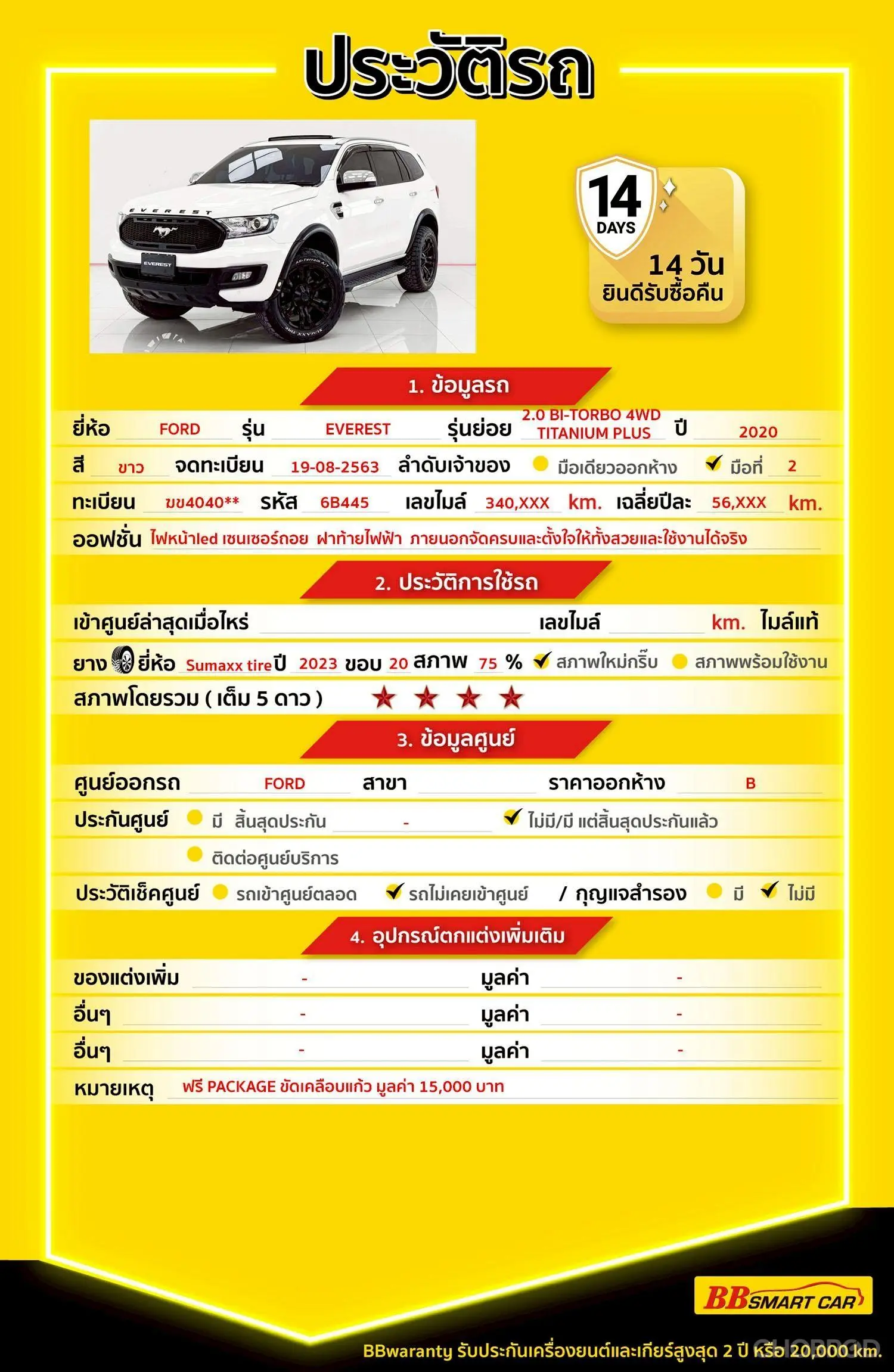 FORD EVEREST 2.0 BI-TORBO 4WD TITANIUM PLUS AT 2020 ออกรถ 0 บาท จัดได้ 669,000 บ. Line:@bbcar06 🔥จอง 199 บาท ส่งบัตรประชาชน รู้ผลพิจารณาภายใน 30 นาที ไม่ผ่านคืนเงินจองทุกกรณี 🔥ซื้อรถกับ BB พร้อมให้คำปรึกษา แก้ทุกปัญหา ให้ทุกเรื่อง บริการ call center 24 ชม. 🔥BB Care Plus รับประกันหลังการขาย สูงสุด 2 ปี หรือ 20,000 km.. 🔥มีรถให้เลือกมากกว่า 1,800 คัน สาขา 6 ศูนย์รวมรถยนต์ไอคาร์สยาม กาญจนาภิเษก รหัสรถ 6B445 ราคา 649,000 บาท ผ่อนเพียง 11,033 บาท Brand. : FORD Year. : 2020 Model. : EVEREST Grade. : 2.0 BI-TORBO 4WD TITANIUM PLUS Engine. : 2,000 CC Type. : ดีเซล Gearbox : AT4WD Color. : ขาว Mileage. : 340,xxx KM. (ซื้อสด ราคานี้ยังไม่รวมค่าดำเนินการ 10,000 บ.) 🚩 Price. 649,000 บาท ยอดจัด : 659,000 บาท เงินดาวน์ : 0 บาท ประกันภัย : ฟรีประกันภัย 1 ปี ค่าดำเนินการ : 10,000 บาท รวมออกรถ : 0 บาท ผ่อน 36 = 21,227 บาท ผ่อน 48 = 16,329 บาท ผ่อน 60 = 13,568 บาท ผ่อน 72 = 12,138 บาท ผ่อน 84 = 11,033 บาท เงื่อนไขเป็นไปตามที่ไฟแนนซ์กำหนด โปรโมชั่นพิเศษ สำหรับลูกค้าเครดิตดี 🚩เลือกรับเรทดอกเบี้ยพิเศษ 📍36 งวด = 1.29 % 📍48 งวด = 1.99 % 📍60 งวด = 2.39 % 📍72 งวด = 3.59 % 🔥 เงื่อนไข โปรโมชั่น ดอกเบี้ยเริ่มต้น 1.29% ตลอดอายุสัญญา - ยอดจัดไฟแนนซ์ 300,000-600,0000 บาท - ผ่อนสูงสุด 72 เดือน - เป็นลูกค้าประวัติดี พนักงานประจำเงินเดือน 20,000 ขึ้นไป - ค่าดำเนินการแคมเปญ 20,000 บาท (รวมในยอดจัดได้) 🎗Car Hightlight รถสวยๆ วันนี้ขอแนะนำ FORD EVEREST 2.0 BI-TORBO 4WD TITANIUM PLUS AT 2020 ออฟชั่น 12.2.1 :ไฟหน้าled 12.2.2 :เซนเซอร์ถอย 12.2.3 :เครื่องยนประหยัดน้ำมัร 🎗ภายใน ไมล์ Digital จอ LCD เล่น DVD Airbag ซันรูฟ เบาะหนัง เบรค ABS เบาะไฟฟ้าคู่หน้า พวงมาลัย Multifunction แอร์ AUTO 🎗ภายนอก เซนเซอร์รอบคัน บันไดข้าง ไฟเลี้ยวกระจกมองข้าง คิ้วกันสาด แม็กลายเนอร์ เซนเซอร์ถอยหลัง 🎗ความคุ้มค่า สำหรับคันนี้หากเปรียบเทียบราคากับคุณภาพ คันนี้ถือว่าคุ้มค่ามากค่ะ ผ่อนสบายๆก็มีรถขับได้ รถดีมีคุณภาพแบบนี้รีบตัดสินใจซื้อได้เลราคานี้มาไวไปไวนะคะ ⭐️การรับประกันหลังการขาย BB Care Plus สูงสุด 2 ปี หรือ 20,000 km. ด้วยช่างที่ผ่านการอบรมจากศูนย์ชั้นนำของประเทศ 🎉🎉Special offer เฉพาะ บีบีสมาร์ทคาร์ ที่นี่ที่เดียว ⭐️ ดอกเบี้ยเริ่มต้น 1.29% มีไฟแนนซ์รองรับหลายที่ค่ะ ⭐️ ฟรี!! แพคเก็จ ขัดเคลือบแก้ว มูลค่า 15,000 บาท ทุกคัน ⭐️ อนุมัติไว 30 นาที นำเอกสารมาให้ครบรับรถกลับบ้านทันทีค่ะ ⭐️ BB Care Plus รับประกันหลังการขาย สูงสุด 2 ปี หรือ 20,000 km. ⭐️ มี 6 สาขา ในกรุงเทพและปริมณฑลใกล้บ้านท่าน ⭐️ รถทุกคันผ่านตรวจสอบ Inspection เรียบแล้วค่ะ ผ่าน 5 ดาวทุกคันค่ะ ⭐️ เซลล์ทุกท่านเป็นมืออาชีพพร้อมให้บริการทุกท่านแน่นอนค่ะ