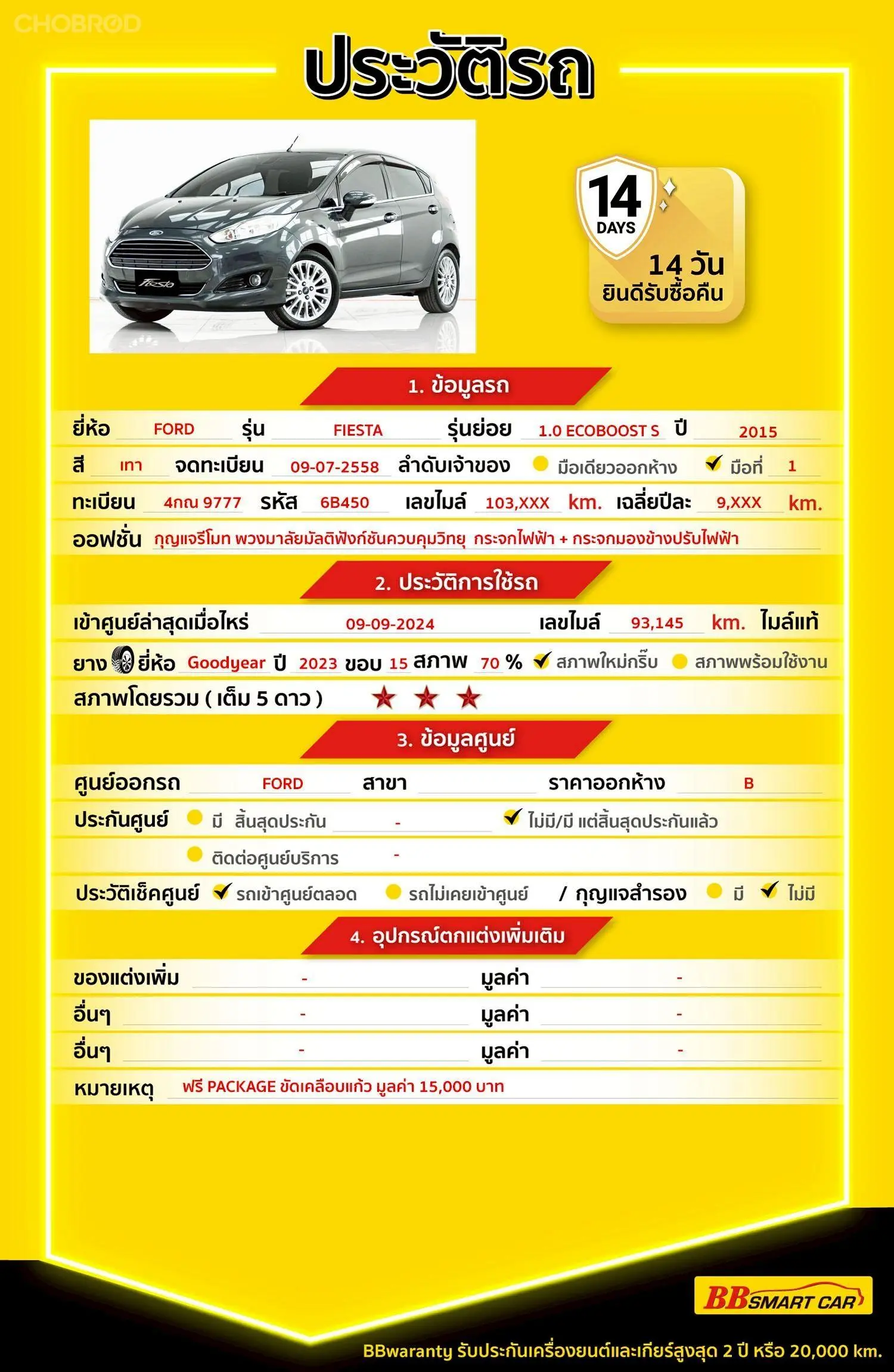 FORD FIESTA 1.0 ECOBOOST S AT 2015 129,000 (ขายสดเท่านั้น) Line:@bbcar06 🔥จอง 199 บาท ส่งบัตรประชาชน รู้ผลพิจารณาภายใน 30 นาที ไม่ผ่านคืนเงินจองทุกกรณี 🔥ซื้อรถกับ BB พร้อมให้คำปรึกษา แก้ทุกปัญหา ให้ทุกเรื่อง บริการ call center 24 ชม. 🔥BB Care Plus รับประกันหลังการขาย สูงสุด 2 ปี หรือ 20,000 km.. 🔥มีรถให้เลือกมากกว่า 1,800 คัน 6B450 สาขา 6 ศูนย์รวมรถไอคาร์สยาม กาญจนาภิเษก ราคา 129,000 บ. (ขายสดเท่านั้น) เรารอตอบคำถามสำหรับลูกค้าที่น่ารักทุกท่านคะ BBsmartcar 6 Promotion sale for today (ซื้อสดราคานี้ยังไม่รวมค่าดำเนินการ 10,000 บาท) Brand. : FORD Year : 2015 Model. : FIESTA Grade : 1.0 ECOBOOST S Engine. : 1,000 cc. Type. : เบนซิน Gearbox : AT Color. : เทา Mileage. : 103,xxx km. Accessories : FORD FIESTA 1.0 ECOBOOST S AT 2015 12.2.1 :1. เครื่องยนต์ Turbo ประสิทธิภาพดี + ประหยัดน้ำมัน • ใช้ เครื่องยนต์ 1.0 ลิตร EcoBoost แบบ 3 สูบเทอร์โบ (Turbo) ให้แรงม้าประมาณ 120-140 PS (ขึ้นกับตลาด/ช่วงผลิต) ประวัติข้อมูลรถ : เป็นรถใช้แล้ว ตัวรถไม่มีอุบัติเหตุหรือน้ำท่วม BBsmartcar service : ฟรีค่าแรงซ่อมบำรุง 3 เดือน หรือ 5,000 Km. BBsmartcar The Best Quality Used Car ที่สุดแห่งคุณภาพรถยนต์มือสอง รับชมรถคุณภาพดีมากกว่า 1,800 คัน ได้บนมือถือของคุณได้แล้ว >> http\://www.bbsmartcar.com/ ลิ้ง Line: https\://line.me/ti/p/1LW23pbPFI รวมคำถาม+คำตอบ ครบๆ แอด line มานะคะ - ติดแบล็คลิสต์ - ติดล่าช้า ติดค้ำ ปล่อยยึด/คืน - ช่องทางการติดต่อเซล์ - คำถามยอดฮิต - แผ่นที่มาโชว์รูม - ต้องการดูรูปรถ - เว็บไซต์/เว็บเพจ - เอกสาร การจัดไฟแนนซ์ ******************************************