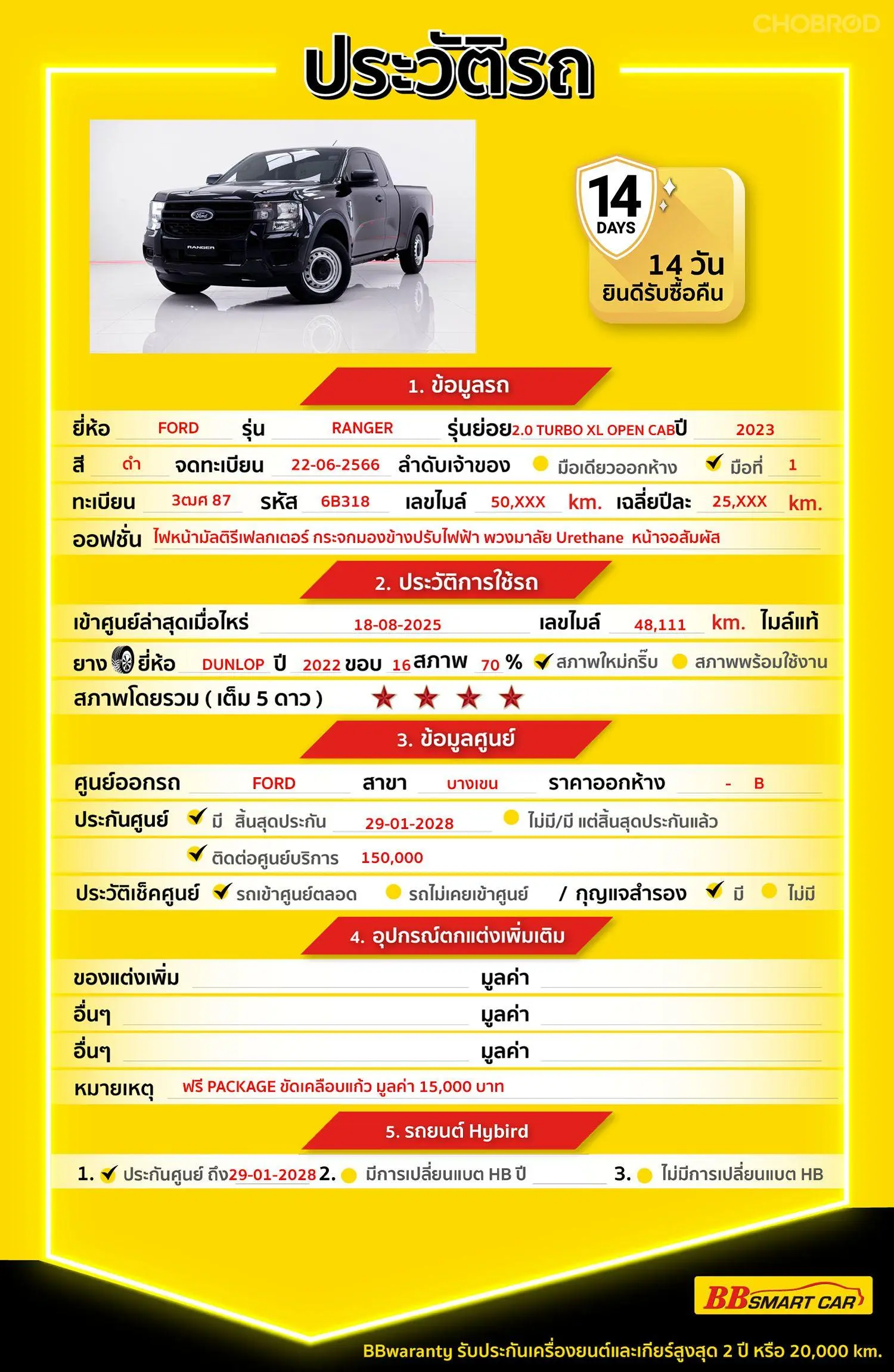 มีการรับประกันจากดีลเลอร์ (6 เดือน) มีบริการช่วยเหลือฉุกเฉินบนท้องถนน 24 ชม. จากดีลเลอร์