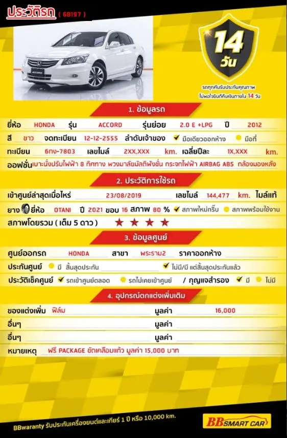 HONDA ACCORD 2.0 E AT 2012 ออกรถ 0 บาท จัดได้ 309,000 บ. Line:@*******แสดงข้อมูล 🔥จอง 199 บาท ส่งบัตรประชาชน รู้ผลพิจารณาภายใน 30 นาที ไม่ผ่านคืนเงินจองทุกกรณี 🔥ซื้อรถกับ BB พร้อมให้คำปรึกษา แก้ทุกปัญหา ให้ทุกเรื่อง บริการ call center 24 ชม. 🔥BB Care Plus รับประกันหลังการขาย สูงสุด 2 ปี หรือ 20,000 km.. 🔥มีรถให้เลือกมากกว่า 1,800 คัน สาขา 6 ศูนย์รวมรถยนต์ไอคาร์สยาม กาญจนาภิเษก รหัสรถ 6B197 ราคา 289,000 บาท ผ่อนเพียง 5,905 บาท Brand. : HONDA Year. : 2012 Model. : ACCORD Grade. : 2.0 E Engine. : 2,000 CC Type. : เบนซิน,LPG Gearbox : AT Color. : ขาว Mileage. : 204,xxx KM. (ซื้อสด ราคานี้ยังไม่รวมค่าดำเนินการ 10,000 บ.) 🚩 Price. 289,000 บาท ยอดจัด : 299,000 บาท เงินดาวน์ : 0 บาท ประกันภัย : ฟรีประกันภัย 1 ปี ค่าดำเนินการ : 10,000 บาท รวมออกรถ : 0 บาท ผ่อน 36 = 10,458 บาท ผ่อน 48 = 8,199 บาท ผ่อน 60 = 7,048 บาท ผ่อน 72 = 6,280บาท ผ่อน 84 = 5,905 บาท เงื่อนไขเป็นไปตามที่ไฟแนนซ์กำหนด โปรโมชั่นพิเศษ สำหรับลูกค้าเครดิตดี 🚩เลือกรับเรทดอกเบี้ยพิเศษ 📍36 งวด = 1.29 % 📍48 งวด = 1.99 % 📍60 งวด = 2.39 % 📍72 งวด = 3.59 % 🔥 เงื่อนไข โปรโมชั่น ดอกเบี้ยเริ่มต้น 1.29% ตลอดอายุสัญญา - ยอดจัดไฟแนนซ์ 300,000-600,0000 บาท - ผ่อนสูงสุด 72 เดือน - เป็นลูกค้าประวัติดี พนักงานประจำเงินเดือน 20,000 ขึ้นไป - ค่าดำเนินการแคมเปญ 20,000 บาท (รวมในยอดจัดได้) 🎗Car Hightlight รถสวยๆ วันนี้ขอแนะนำ HONDA ACCORD 2.0 E +LPG ATเบนซิน+LPG ออฟชั่น 12.2.1 : เบาะนั่งปรับไฟฟ้า 8 ทิศทาง 12.2.2 :พวงมาลัยมัลติฟังชั่น 12.2.3 ::กล้องมองหลัง ขณะถอย 🎗ภายใน เบาะไฟฟ้าคนขับ กระจกไฟฟ้า วิทยุ - CD Airbag แอร์ เบรค ABS เซ็นทรัลล๊อก พวงมาลัย Multifunction กล้องส่องหลัง 🎗ภายนอก กระจกไฟฟ้า AIRBAG ABS 🎗ความคุ้มค่า สำหรับคันนี้หากเปรียบเทียบราคากับคุณภาพ คันนี้ถือว่าคุ้มค่ามากค่ะ ผ่อนสบายๆก็มีรถขับได้ รถดีมีคุณภาพแบบนี้รีบตัดสินใจซื้อได้เลราคานี้มาไวไปไวนะคะ ⭐️การรับประกันหลังการขาย BB Care Plus สูงสุด 2 ปี หรือ 20,000 km. ด้วยช่างที่ผ่านการอบรมจากศูนย์ชั้นนำของประเทศ 🎉🎉Special offer เฉพาะ บีบีสมาร์ทคาร์ ที่นี่ที่เดียว ⭐️ ดอกเบี้ยเริ่มต้น 1.29% มีไฟแนนซ์รองรับหลายที่ค่ะ ⭐️ ฟรี!! แพคเก็จ ขัดเคลือบแก้ว มูลค่า 15,000 บาท ทุกคัน ⭐️ อนุมัติไว 30 นาที นำเอกสารมาให้ครบรับรถกลับบ้านทันทีค่ะ ⭐️ BB Care Plus รับประกันหลังการขาย สูงสุด 2 ปี หรือ 20,000 km. ⭐️ มี 6 สาขา ในกรุงเทพและปริมณฑลใกล้บ้านท่าน ⭐️ รถทุกคันผ่านตรวจสอบ Inspection เรียบแล้วค่ะ ผ่าน 5 ดาวทุกคันค่ะ ⭐️ เซลล์ทุกท่านเป็นมืออาชีพพร้อมให้บริการทุกท่านแน่นอนค่ะ