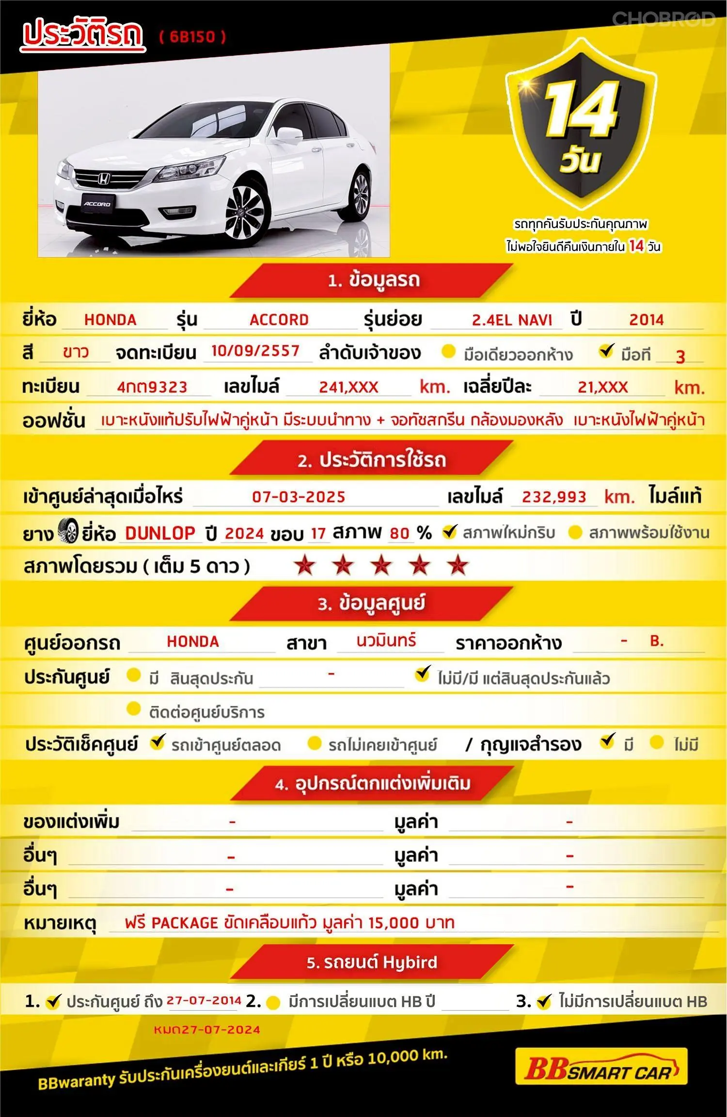 HONDA ACCORD 2.4 EL Navi 2014 ออกรถ 0 บาท จัดได้ 399,000 บ Line:@bbcar06 🔥จอง 199 บาท ส่งบัตรประชาชน รู้ผลพิจารณาภายใน 30 นาที ไม่ผ่านคืนเงินจองทุกกรณี 🔥ซื้อรถกับ BB พร้อมให้คำปรึกษา แก้ทุกปัญหา ให้ทุกเรื่อง บริการ call center 24 ชม. 🔥BB Care Plus รับประกันหลังการขาย สูงสุด 2 ปี หรือ 20,000 km.. 🔥มีรถให้เลือกมากกว่า 1,600 คัน สาขา 6 ศูนย์รวมรถยนต์ไอคาร์สยาม กาญจนาภิเษก รหัสรถ 6B150 ราคา 379,000 บาท ผ่อนเพียง 6,998 บาท Brand. : HONDA Year. : 2014 Model. : ACCORD Grade. : 2.4EL NAVI Engine. : 2,400 CC Type. : เบนซิน Gearbox : AT Color. : ขาว Mileage. : 241,xxx KM. (ซื้อสด ราคานี้ยังไม่รวมค่าดำเนินการ 10,000 บ.) 🚩 Price. 379,000 บาท ยอดจัด : 389,000 บาท เงินดาวน์ : 0 บาท ประกันภัย : ฟรีประกันภัย 1 ปี ค่าดำเนินการ : 10,000 บาท รวมออกรถ : 0 บาท ผ่อน 36 = 12,912 บาท ผ่อน 48 = 10,021 บาท ผ่อน 60 = 8,356 บาท ผ่อน 72 = 7,511 บาท ผ่อน 84 = 6,998 บาท เงื่อนไขเป็นไปตามที่ไฟแนนซ์กำหนด โปรโมชั่นพิเศษ สำหรับลูกค้าเครดิตดี 🚩เลือกรับเรทดอกเบี้ยพิเศษ 📍36 งวด = 1.29 % 📍48 งวด = 1.99 % 📍60 งวด = 2.39 % 📍72 งวด = 3.59 % 🔥 เงื่อนไข โปรโมชั่น ดอกเบี้ยเริ่มต้น 1.29% ตลอดอายุสัญญา - ยอดจัดไฟแนนซ์ 300,000-600,0000 บาท - ผ่อนสูงสุด 72 เดือน - เป็นลูกค้าประวัติดี พนักงานประจำเงินเดือน 20,000 ขึ้นไป - ค่าดำเนินการแคมเปญ 20,000 บาท (รวมในยอดจัดได้) 🎗Car Hightlight รถสวยๆ วันนี้ขอแนะนำ HONDA ACCORD 2.4EL NAVI AT เบนซิน ออฟชั่น 12.2.1 :มีระบบนำทาง + จอทัชสกรีน 12.2.2 :เบาะหนังไฟฟ้า + Memory Seat 12.2.3 : Honda LaneWatch + กล้องรอบคัน 🎗ภายใน แอร์ AUTO เบาะไฟฟ้าคู่หน้า พวงมาลัย Multifunction Airbag จอ LCD เล่น DVD กระจกมองข้างปรับไฟฟ้า เซ็นทรัลล๊อก พวงมาลัยเพาเวอร์ กระจกไฟฟ้า Cruise Control เบรค ABS 🎗ภายนอก ไฟโปรเจคเตอร์ ไฟตัดหมอก ไฟเลี้ยวกระจกมองข้าง ล้อแม็ก 🎗ความคุ้มค่า สำหรับคันนี้หากเปรียบเทียบราคากับคุณภาพ คันนี้ถือว่าคุ้มค่ามากค่ะ ผ่อนสบายๆก็มีรถขับได้ รถดีมีคุณภาพแบบนี้รีบตัดสินใจซื้อได้เลราคานี้มาไวไปไวนะคะ ⭐️การรับประกันหลังการขาย BB Care Plus สูงสุด 2 ปี หรือ 20,000 km. ด้วยช่างที่ผ่านการอบรมจากศูนย์ชั้นนำของประเทศ 🎉🎉Special offer เฉพาะ บีบีสมาร์ทคาร์ ที่นี่ที่เดียว ⭐️ ดอกเบี้ยเริ่มต้น 1.29% มีไฟแนนซ์รองรับหลายที่ค่ะ ⭐️ ฟรี!! แพคเก็จ ขัดเคลือบแก้ว มูลค่า 15,000 บาท ทุกคัน ⭐️ อนุมัติไว 30 นาที นำเอกสารมาให้ครบรับรถกลับบ้านทันทีค่ะ ⭐️ BB Care Plus รับประกันหลังการขาย สูงสุด 2 ปี หรือ 20,000 km. ⭐️ มี 6 สาขา ในกรุงเทพและปริมณฑลใกล้บ้านท่าน ⭐️ รถทุกคันผ่านตรวจสอบ Inspection เรียบแล้วค่ะ ผ่าน 5 ดาวทุกคันค่ะ ⭐️ เซลล์ทุกท่านเป็นมืออาชีพพร้อมให้บริการทุกท่านแน่นอนค่ะ