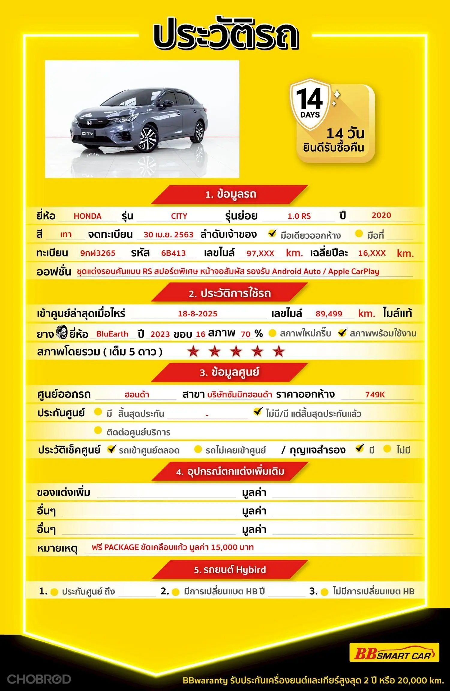 มีการรับประกันจากดีลเลอร์ (6 เดือน) มีบริการช่วยเหลือฉุกเฉินบนท้องถนน 24 ชม. จากดีลเลอร์