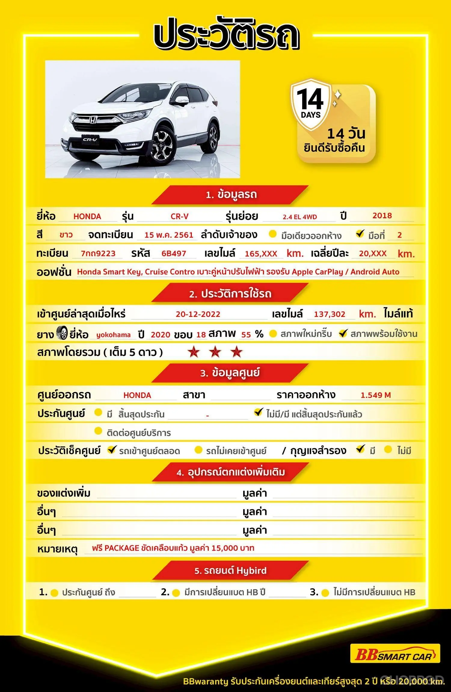 มีการรับประกันจากดีลเลอร์ (6 เดือน) มีบริการช่วยเหลือฉุกเฉินบนท้องถนน 24 ชม. จากดีลเลอร์