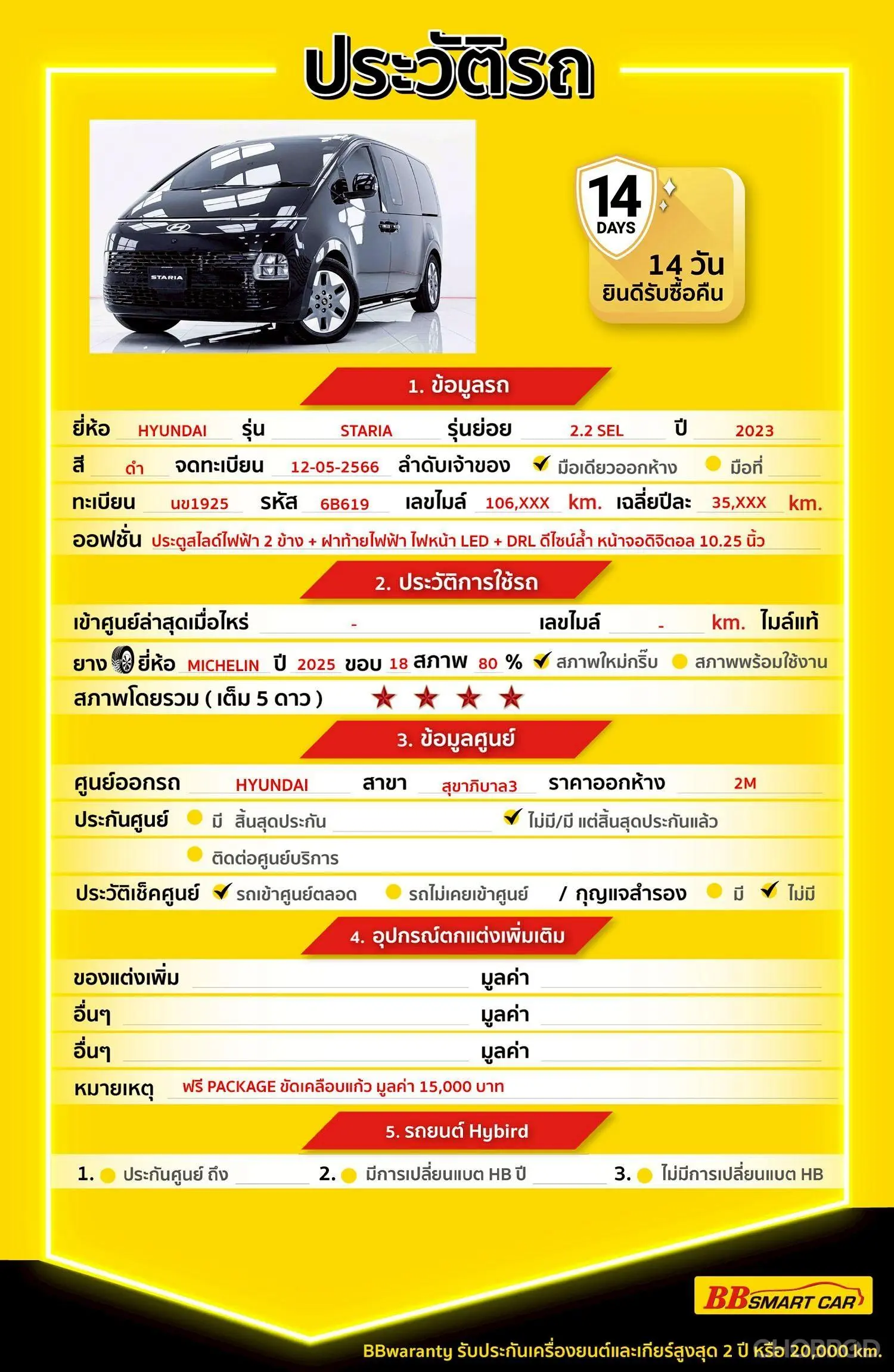 HYUNDAI STARIA 2.2 SEL AT 2023 ออกรถ 0 บาท รหัสรถ 6B619 Line: @bbcar06 *** Highlight *** HYUNDAI STARIA 2.2 SEL ปี 2023 เกียร์ออโต้ 8 สปีด ระบบ Wireless Charger สปอร์ตหรู พรีเมี่ยม ระดับรถผู้บริหาร ภายในกว้างขวาง ฟังก์ชั่น อำนวยความสะดวกครบครัน รถประวัติดี ไร้อุบัติเหตุ ดูแลอย่างสม่ำเสมอ ประหยัดจากราคาป้ายแดงได้ถึง 1 M 💎รถไมล์แท้มือเดียวออกห้าง 💎Wireless Charger 💎ออกที่ศูนย์ HYUNDAI 💎ยางปี 25 ขนาดขอบ 18 💎ราคาออกห้าง 2 M 💎รับประกันไมล์แท้ 100% กรณีตรวจพบการกรอไมล์ ยินดีคืนเงินเต็มจำนวน 💎รับประกันโครงสร้างรถ ไม่เคยประสบอุบัติเหตุหนัก พลิกคว่ำ น้ำท่วม หรือไฟไหม้ โครงสร้างและแชสซีอยู่ในสภาพสมบูรณ์ 💎BB Care Plus รับประกันหลังการขายสูงสุด 2 ปี หรือ 20,000 km. 💎ไม่พอใจ ยินดีคืนเงินภายใน 14 วัน 🔥คลิ๊กที่ลิงก์เพื่อดู วิดีโอคันนี้,ประวัติรถ,รูปภาพภายนอกและรูปภายใน https://www.bbsmartcar.com/web-php/index.php/site/cardetail/2026040380B8242396DA 🔥เรามีรถรุ่นนี้ให้เลือกชมอีก 5 คัน https://www.bbsmartcar.com/web-php/index.php/site/car?name_brand=HYUNDAI&modelCar=STARIA&search=one 🔥มีรถให้เลือกมากกว่า 1,800 คัน https://www.bbsmartcar.com/web-php/index.php/site/home NO. 6B619 Brand. : HYUNDAI Year. : 2023 Model. : STARIA Grade. : 2.2 SEL Engine. : 2,200 CC Type. : ดีเซล Gearbox : AT Color. : ดำ Mileage. : 106,XXX KM. (ซื้อสด ราคานี้ยังไม่รวมค่าดำเนินการ 10,000 บ.) เงินดาวน์ : 0 บาท ประกันภัย : ฟรีประกันภัย 1 ปี ค่าดำเนินการ : 10,000 บาท รวมออกรถ : 0 บาท ผ่อน 72 งวด = 21,409 บาท ผ่อน 84 งวด = 19,532 บาท จุดเด่นออฟชั่น 12.2.1 :หน้าจอ 10.25 นิ้ว รองรับ Apple CarPlay / Android Auto 12.2.2 :ประตูสไลด์ไฟฟ้า 2 ข้าง + ฝาท้ายไฟฟ้า ใช้งานสะดวก 12.2.3 :กล้องรอบคัน + ระบบความปลอดภัยครบ (ช่วยขับขี่สบาย) 🎗ภายใน • แอร์ พวงมาลัยเพาเวอร์ แอร์ราว เบาะหนัง เกียร์ Paddle Shift พวงมาลัย Multifunction กระจกไฟฟ้า จอ LCD เล่น DVD เซ็นทรัลล๊อก แอร์ AUTO กุญแจรีโมท-สัญญานกันขโมย เบรกมือไฟฟ้า Airbag Cruise Control 🎗ภายนอก • กระจกมองข้างปรับไฟฟ้า เบรค ABS ไมล์ Digital บันไดข้าง ล้อแม็ก ไฟเลี้ยวกระจกมองข้าง ไฟโปรเจคเตอร์ กล้องส่องหลัง กระจกมองข้างพับไฟฟ้า เซนเซอร์ถอยหลัง 🎗ความคุ้มค่า สำหรับคันนี้หากเปรียบเทียบราคากับคุณภาพ คันนี้ถือว่าคุ้มค่ามากค่ะ ผ่อนสบายๆก็มีรถขับได้ รถดีมีคุณภาพแบบนี้รีบตัดสินใจซื้อได้เลราคานี้มาไวไปไวนะคะ ⭐️การรับประกันหลังการขาย BB Care Plus สูงสุด 2 ปี หรือ 20,000 km. ด้วยช่างที่ผ่านการอบรมจากศูนย์ชั้นนำของประเทศ 🎉Special offer เฉพาะ บีบีสมาร์ทคาร์ ที่นี่ที่เดียว ⭐ดอกเบี้ยเริ่มต้น 1.29% มีไฟแนนซ์รองรับหลายที่ค่ะ ⭐ฟรี!! แพคเก็จ ขัดเคลือบแก้ว มูลค่า 15,000 บาท ทุกคัน ⭐อนุมัติไว 30 นาที นำเอกสารมาให้ครบรับรถกลับบ้านทันทีค่ะ ⭐มี 6 สาขา ในกรุงเทพและปริมณฑลใกล้บ้านท่าน ⭐รถทุกคันผ่านตรวจสอบ Inspection เรียบร้อยแล้วค่ะ ผ่าน 5 ดาวทุกคันค่ะ ⭐เซลล์ทุกท่านเป็นมืออาชีพพร้อมให้บริการทุกท่านแน่นอนค่ะ ⭐เงื่อนไขเป็นไปตามที่ไฟแนนซ์กำหนด เลือกข