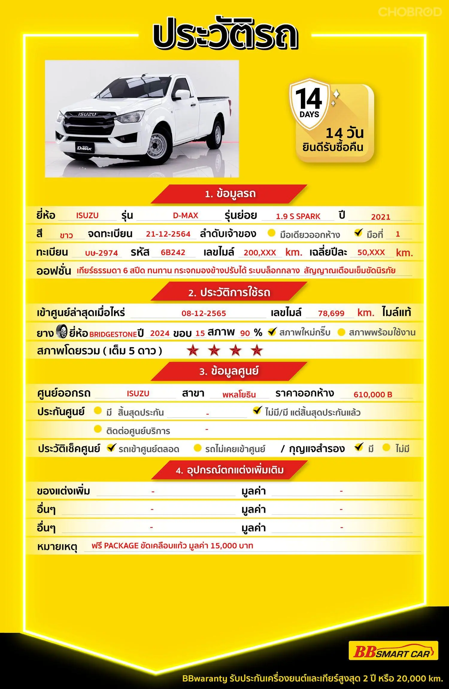 มีการรับประกันจากดีลเลอร์ (6 เดือน) มีบริการช่วยเหลือฉุกเฉินบนท้องถนน 24 ชม. จากดีลเลอร์