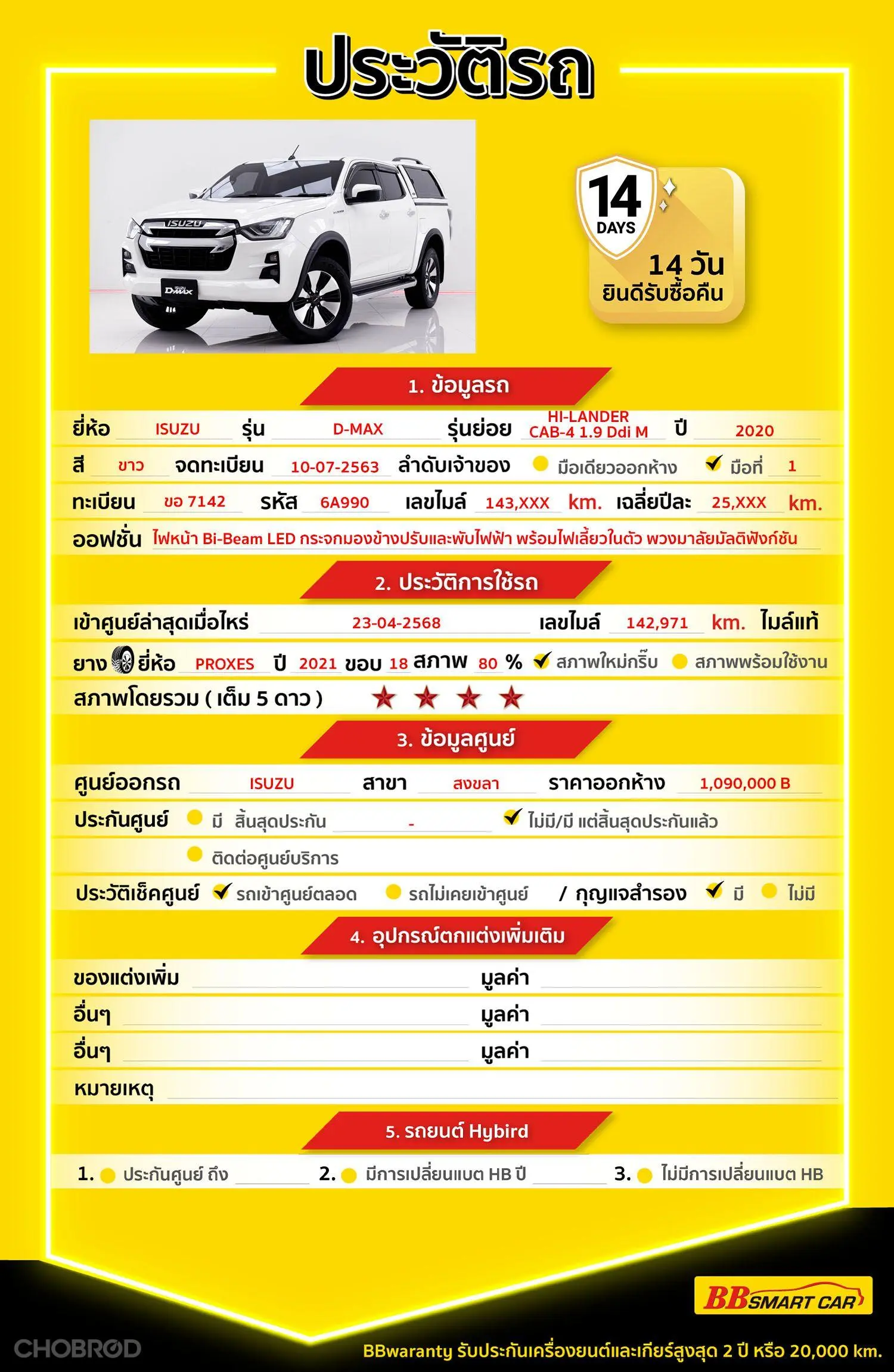 ISUZU D-MAX HI-LANDER CAB-4 1.9 Ddi M 2020 ออกรถ 0 บาท จัดได้ 569,000 บ. Line:@*******แสดงข้อมูล 🔥จอง 199 บาท ส่งบัตรประชาชน รู้ผลพิจารณาภายใน 30 นาที ไม่ผ่านคืนเงินจองทุกกรณี 🔥ซื้อรถกับ BB พร้อมให้คำปรึกษา แก้ทุกปัญหา ให้ทุกเรื่อง บริการ call center 24 ชม. 🔥BB Care Plus รับประกันหลังการขาย สูงสุด 2 ปี หรือ 20,000 km.. 🔥มีรถให้เลือกมากกว่า 1800 คัน สาขา 6 ศูนย์รวมรถยนต์ไอคาร์สยาม กาญจนาภิเษก รหัสรถ 6A990 ราคา 549,000 บาท ผ่อนเพียง 9,945 บาท Brand. : ISUZU Year. : 2020 Model. : D-MAX Grade. : HI-LANDER CAB-4 1.9 DdI M Engine. : 1,900 C Type. : ดีเซล Gearbox : AT Color. : ขาว Mileage. : 143,XXX KM. (ซื้อสด ราคานี้ยังไม่รวมค่าดำเนินการ 10,000 บ.) 🚩 Price. 549,000 บาท ยอดจัด : 559,000 บาท เงินดาวน์ : 0 บาท ประกันภัย : ฟรีประกันภัย 1 ปี ค่าดำเนินการ : 10,000 บาท รวมออกรถ : 0 บาท ผ่อน36 = 19,133 บาท ผ่อน48 = 14,719 บาท ผ่อน60 = 12,230 บาท ผ่อน72 = 10,941 บาท ผ่อน84 = 9,945 บาท เงื่อนไขเป็นไปตามที่ไฟแนนซ์กำหนด โปรโมชั่นพิเศษ สำหรับลูกค้าเครดิตดี 🚩เลือกรับเรทดอกเบี้ยพิเศษ 📍36 งวด = 1.29 % 📍48 งวด = 1.99 % 📍60 งวด = 2.39 % 📍72 งวด = 3.59 % 🔥 เงื่อนไข โปรโมชั่น ดอกเบี้ยเริ่มต้น 1.29% ตลอดอายุสัญญา - ยอดจัดไฟแนนซ์ 300,000-600,0000 บาท - ผ่อนสูงสุด 72 เดือน - เป็นลูกค้าประวัติดี พนักงานประจำเงินเดือน 20,000 ขึ้นไป - ค่าดำเนินการแคมเปญ 20,000 บาท (รวมในยอดจัดได้) 🎗Car Hightlight รถสวยๆ วันนี้ขอแนะนำ ISUZU D-MAX HI-LANDER CAB-4 1.9 Ddi M AT ดีเซล ออฟชั่น 12.2.1 : ระบบเบรก ABS พร้อม EBD และ BA 12.2.2 : ถุงลมนิรภัยคู่หน้า 12.2.3 : ระบบควบคุมเสถียรภาพการทรงตัว (ESC) 🎗ภายใน จอ LCD เล่น DVD เซ็นทรัลล๊อก พวงมาลัย Multifunction Airbag เบรค ABS พวงมาลัยเพาเวอร์ กระจกมองข้างปรับไฟฟ้า เบาะหนัง แอร์ AUTO Navigator กระจกไฟฟ้า 🎗ภายนอก ล้อแม็ก ไฟโปรเจคเตอร์ ไฟตัดหมอก คิ้วกันสาด แม็กลายเนอร์ บันไดข้าง ไฟเลี้ยวกระจกมองข้าง 🎗ความคุ้มค่า สำหรับคันนี้หากเปรียบเทียบราคากับคุณภาพ คันนี้ถือว่าคุ้มค่ามากค่ะ ผ่อนสบายๆก็มีรถขับได้ รถดีมีคุณภาพแบบนี้รีบตัดสินใจซื้อได้เลราคานี้มาไวไปไวนะคะ ⭐️การรับประกันหลังการขาย BB Care Plus สูงสุด 2 ปี หรือ 20,000 km. ด้วยช่างที่ผ่านการอบรมจากศูนย์ชั้นนำของประเทศ 🎉🎉Special offer เฉพาะ บีบีสมาร์ทคาร์ ที่นี่ที่เดียว ⭐️ ดอกเบี้ยเริ่มต้น 1.29% มีไฟแนนซ์รองรับหลายที่ค่ะ ⭐️ ฟรี!! แพคเก็จ ขัดเคลือบแก้ว มูลค่า 15,000 บาท ทุกคัน ⭐️ อนุมัติไว 30 นาที นำเอกสารมาให้ครบรับรถกลับบ้านทันทีค่ะ ⭐️ BB Care Plus รับประกันหลังการขาย สูงสุด 2 ปี หรือ 20,000 km. ⭐️ มี 6 สาขา ในกรุงเทพและปริมณฑลใกล้บ้านท่าน ⭐️ รถทุกคันผ่านตรวจสอบ Inspection เรียบแล้วค่ะ ผ่าน 5 ดาวทุกคันค่ะ ⭐️ เซลล์ทุกท่านเป็นมืออาชีพพร้อมให้บริการทุกท่านแน่นอนค่ะ