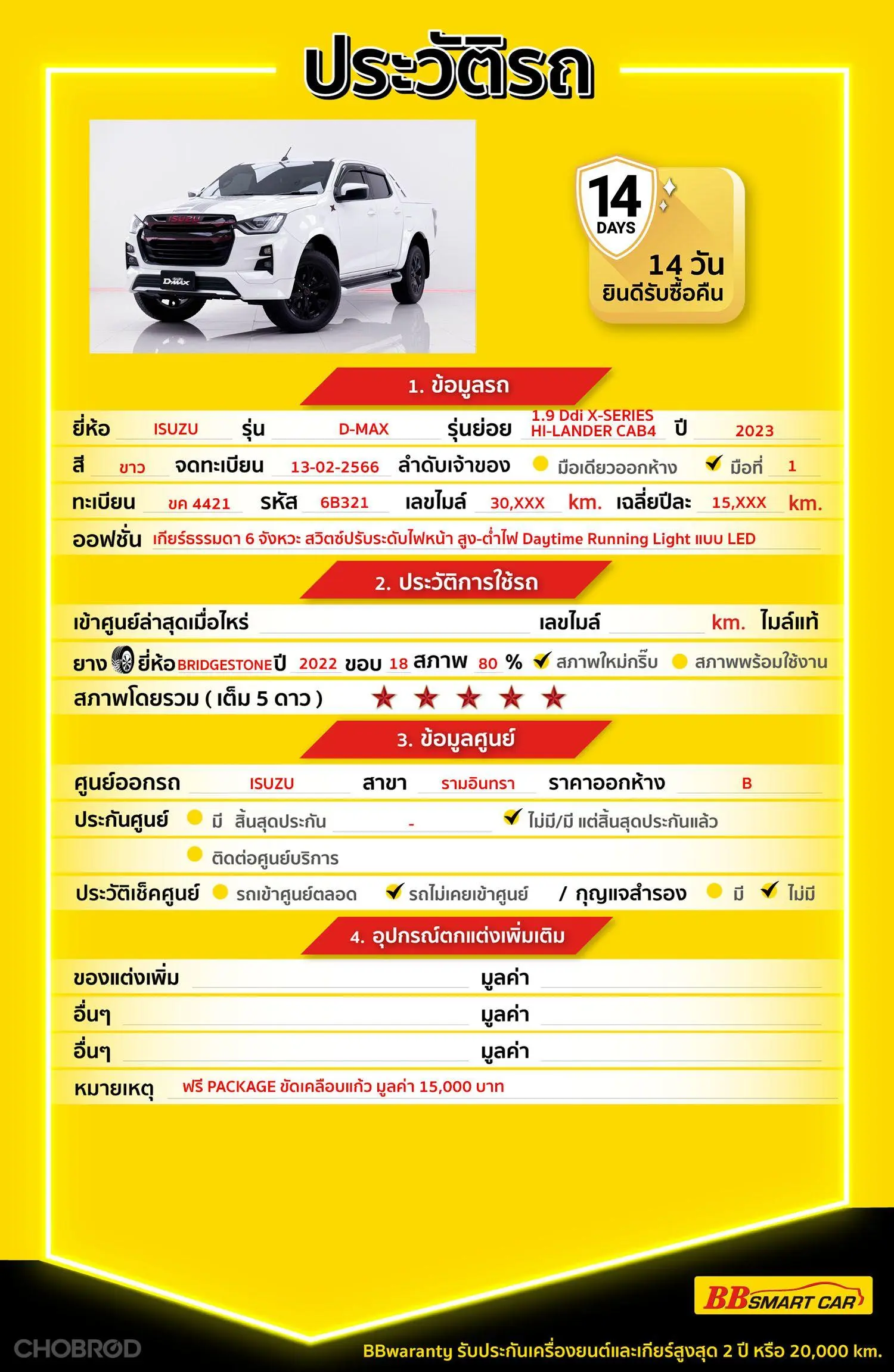 ISUZU D-MAX 1.9 DDI X-SERIES HI-LANDER CAB4 MT 2023 ออกรถ 0 บาท จัดได้ 689,000 บ. Line:@*******แสดงข้อมูล 🔥จอง 199 บาท ส่งบัตรประชาชน รู้ผลพิจารณาภายใน 30 นาที ไม่ผ่านคืนเงินจองทุกกรณี 🔥ซื้อรถกับ BB พร้อมให้คำปรึกษา แก้ทุกปัญหา ให้ทุกเรื่อง บริการ call center 24 ชม. 🔥BB Care Plus รับประกันหลังการขาย สูงสุด 2 ปี หรือ 20,000 km.. 🔥มีรถให้เลือกมากกว่า 1,800 คัน สาขา 6 ศูนย์รวมรถยนต์ไอคาร์สยาม กาญจนาภิเษก รหัสรถ 6B321 ราคา 669,000 บาท ผ่อนเพียง 11,703 บาท Brand. : ISUZU Year. : 2023 Model. : D-MAX Grade. :1.9 DDI X-SERIES HI-LANDER CAB4 Engine. : 1,900 CC Type. : ดีเซล Gearbox : MT Color. : ขาว Mileage. : 30,xxx KM. (ซื้อสด ราคานี้ยังไม่รวมค่าดำเนินการ 10,000 บ.) 🚩 Price. 669,000 บาท ยอดจัด : 679,000 บาท เงินดาวน์ : 0 บาท ประกันภัย : ฟรีประกันภัย 1 ปี ค่าดำเนินการ : 10,000 บาท รวมออกรถ : 0 บาท ผ่อน 36 = 22,515 บาท ผ่อน 48 = 17,321 บาท ผ่อน 60 = 14,392 บาท ผ่อน 72 = 12,875 บาท ผ่อน 84 = 11,703 บาท เงื่อนไขเป็นไปตามที่ไฟแนนซ์กำหนด โปรโมชั่นพิเศษ สำหรับลูกค้าเครดิตดี 🚩เลือกรับเรทดอกเบี้ยพิเศษ 📍36 งวด = 1.29 % 📍48 งวด = 1.99 % 📍60 งวด = 2.39 % 📍72 งวด = 3.59 % 🔥 เงื่อนไข โปรโมชั่น ดอกเบี้ยเริ่มต้น 1.29% ตลอดอายุสัญญา - ยอดจัดไฟแนนซ์ 300,000-600,0000 บาท - ผ่อนสูงสุด 72 เดือน - เป็นลูกค้าประวัติดี พนักงานประจำเงินเดือน 20,000 ขึ้นไป - ค่าดำเนินการแคมเปญ 20,000 บาท (รวมในยอดจัดได้) 🎗Car Hightlight รถสวยๆ วันนี้ขอแนะนำ ISUZU D-MAX 1.9 DDI X-SERIES HI-LANDER CAB4 MT 2023 ออฟชั่น 12.2.1 : เครื่องยนต์ดีเซล 1.9 เทอร์โบ 150 แรงม้า 350 นิวตันเมตร เกียร์ธรรมดา 6 จังหวะ พร้อม Genius Sport Shift ระบบเบรกด้านหน้าดิสก์เบรก แบบมีครีบระบายความร้อน / ด้านหลัง ดรัมเบรก ล้ออัลลอย สีเงิน ขนาด 16 นิ้ว 16 ” x 6.5J ยาง ขนาด 215/70 R16 ไฟหน้า Projector Lens แบบ Bi-Beam LED สวิตซ์ปรับระดับไฟหน้า สูง-ต่ำ ไฟ Daytime Running Light แบบ LED ไฟตัดหมอกคู่หน้า 🎗ภายใน กระจกไฟฟ้า เบรค ABS กระจกมองข้างปรับไฟฟ้า จอ LCD เล่น DVD พวงมาลัยเพาเวอร์ แอร์ พวงมาลัย Multifunction Airbag เบาะหนัง 🎗ภายนอก เซ็นทรัลล๊อก ไฟตัดหมอก แม็กลายเนอร์ ล้อแม็ก บันไดข้าง คิ้วกันสาด 🎗ความคุ้มค่า สำหรับคันนี้หากเปรียบเทียบราคากับคุณภาพ คันนี้ถือว่าคุ้มค่ามากค่ะ ผ่อนสบายๆก็มีรถขับได้ รถดีมีคุณภาพแบบนี้รีบตัดสินใจซื้อได้เลราคานี้มาไวไปไวนะคะ ⭐️การรับประกันหลังการขาย BB Care Plus สูงสุด 2 ปี หรือ 20,000 km. ด้วยช่างที่ผ่านการอบรมจากศูนย์ชั้นนำของประเทศ 🎉🎉Special offer เฉพาะ บีบีสมาร์ทคาร์ ที่นี่ที่เดียว ⭐️ ดอกเบี้ยเริ่มต้น 1.29% มีไฟแนนซ์รองรับหลายที่ค่ะ ⭐️ ฟรี!! แพคเก็จ ขัดเคลือบแก้ว มูลค่า 15,000 บาท ทุกคัน ⭐️ อนุมัติไว 30 นาที นำเอกสารมาให้ครบรับรถกลับบ้านทันทีค่ะ ⭐️ BB Care Plus รับประกันหลังการขาย สูงสุด 2 ปี หรือ 20,000 km. ⭐️ มี 6 สาขา ในกรุงเทพและปริมณฑลใกล้บ้านท่าน ⭐️ รถทุกคันผ่านตรวจสอบ Inspection เรียบแล้วค่ะ ผ่าน 5 ดาวทุกคันค่ะ ⭐️ เซลล์ทุกท่านเป็นมืออาชีพพร้อมให้บริการทุกท่านแน่นอนค่