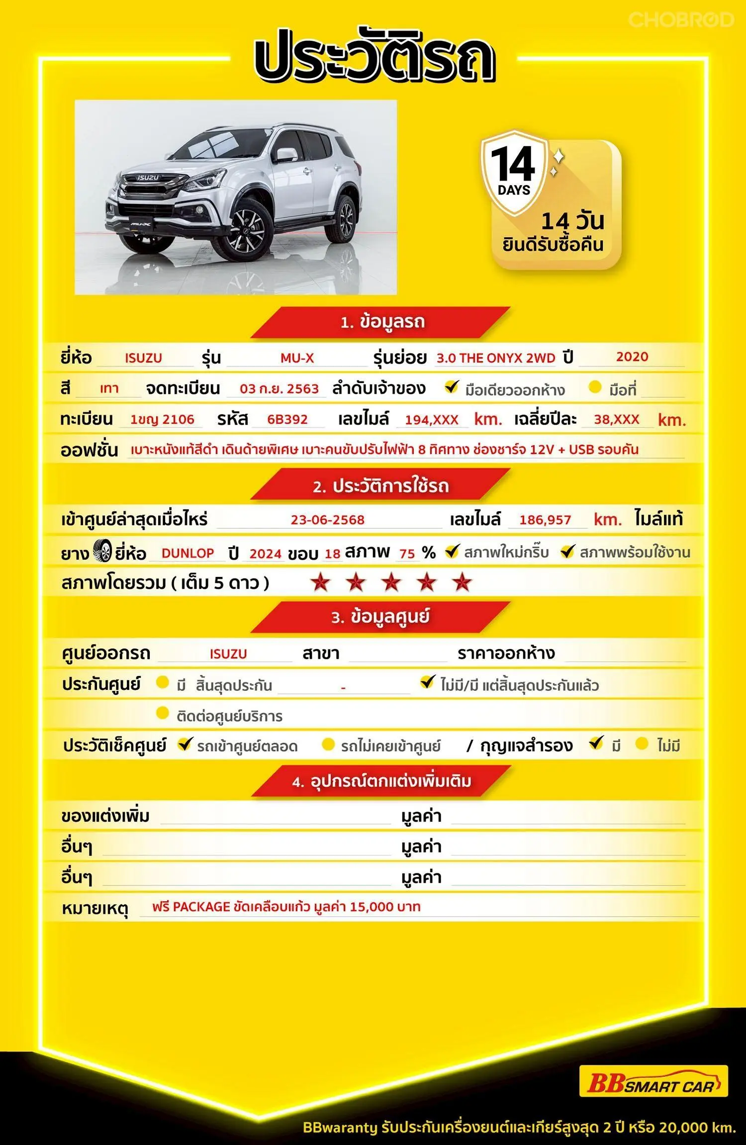 ISUZU MU-X 3.0 THE ONYX 2WD AT 2020 ออกรถ 0 บาท จัดได้ 769,000 บ. Line:@*******แสดงข้อมูล 🔥จอง 199 บาท ส่งบัตรประชาชน รู้ผลพิจารณาภายใน 30 นาที ไม่ผ่านคืนเงินจองทุกกรณี 🔥ซื้อรถกับ BB พร้อมให้คำปรึกษา แก้ทุกปัญหา ให้ทุกเรื่อง บริการ call center 24 ชม. 🔥BB Care Plus รับประกันหลังการขาย สูงสุด 2 ปี หรือ 20,000 km.. 🔥มีรถให้เลือกมากกว่า 1,800 คัน สาขา 6 ศูนย์รวมรถยนต์ไอคาร์สยาม กาญจนาภิเษก รหัสรถ 6B392 ราคา 749,000 บาท ผ่อนเพียง 12,372 บาท Brand. : ISUZU Year. : 2020 Model. : MU-X Grade. : 3.0 THE ONYX 2WD Engine. : 3,000 CC Type. : ดีเซล Gearbox : AT Color. : เทา Mileage. : 194,xxx KM. (ซื้อสด ราคานี้ยังไม่รวมค่าดำเนินการ 10,000 บ.) 🚩 Price. 749,000 บาท ยอดจัด : 759,000 บาท เงินดาวน์ : 0 บาท ประกันภัย : ฟรีประกันภัย 1 ปี ค่าดำเนินการ : 10,000 บาท รวมออกรถ : 0 บาท ผ่อน 36 = 23,803 บาท ผ่อน 48 = 18,312 บาท ผ่อน 60 = 15,215 บาท ผ่อน 72 = 13,611 บาท ผ่อน 84 = 12,372 บาท เงื่อนไขเป็นไปตามที่ไฟแนนซ์กำหนด โปรโมชั่นพิเศษ สำหรับลูกค้าเครดิตดี 🚩เลือกรับเรทดอกเบี้ยพิเศษ 📍36 งวด = 1.29 % 📍48 งวด = 1.99 % 📍60 งวด = 2.39 % 📍72 งวด = 3.59 % 🔥 เงื่อนไข โปรโมชั่น ดอกเบี้ยเริ่มต้น 1.29% ตลอดอายุสัญญา - ยอดจัดไฟแนนซ์ 300,000-600,0000 บาท - ผ่อนสูงสุด 72 เดือน - เป็นลูกค้าประวัติดี พนักงานประจำเงินเดือน 20,000 ขึ้นไป - ค่าดำเนินการแคมเปญ 20,000 บาท (รวมในยอดจัดได้) 🎗Car Hightlight รถสวยๆ วันนี้ขอแนะนำ ISUZU MU-X 3.0 THE ONYX 2WD AT 2020 ออฟชั่น 12.2.1 :1) เครื่องแรง ทนทาน ประหยัดมาก • เครื่องยนต์ 3.0 Ddi Blue Power 190 แรงม้า / 450 Nm • แรงต้น–กลางดี เหมาะกับบรรทุก / ทางไกล • ค่าดูแลไม่แพง อะไหล่หาง่าย ทนสไตล์อีซูซุ 🎗ภายใน พวงมาลัยเพาเวอร์ เบรค ABS แอร์ AUTO Airbag กระจกมองข้างปรับไฟฟ้า กระจกไฟฟ้า พวงมาลัย Multifunction เบาะไฟฟ้าคนขับ จอ LCD เล่น DVD เซ็นทรัลล๊อก 🎗ภายนอก บันไดข้าง ไฟโปรเจคเตอร์ ไฟเลี้ยวกระจกมองข้าง ไฟตัดหมอก ล้อแม็ก 🎗ความคุ้มค่า สำหรับคันนี้หากเปรียบเทียบราคากับคุณภาพ คันนี้ถือว่าคุ้มค่ามากค่ะ ผ่อนสบายๆก็มีรถขับได้ รถดีมีคุณภาพแบบนี้รีบตัดสินใจซื้อได้เลราคานี้มาไวไปไวนะคะ ⭐️การรับประกันหลังการขาย BB Care Plus สูงสุด 2 ปี หรือ 20,000 km. ด้วยช่างที่ผ่านการอบรมจากศูนย์ชั้นนำของประเทศ 🎉🎉Special offer เฉพาะ บีบีสมาร์ทคาร์ ที่นี่ที่เดียว ⭐️ ดอกเบี้ยเริ่มต้น 1.29% มีไฟแนนซ์รองรับหลายที่ค่ะ ⭐️ ฟรี!! แพคเก็จ ขัดเคลือบแก้ว มูลค่า 15,000 บาท ทุกคัน ⭐️ อนุมัติไว 30 นาที นำเอกสารมาให้ครบรับรถกลับบ้านทันทีค่ะ ⭐️ BB Care Plus รับประกันหลังการขาย สูงสุด 2 ปี หรือ 20,000 km. ⭐️ มี 6 สาขา ในกรุงเทพและปริมณฑลใกล้บ้านท่าน ⭐️ รถทุกคันผ่านตรวจสอบ Inspection เรียบแล้วค่ะ ผ่าน 5 ดาวทุกคันค่ะ ⭐️ เซลล์ทุกท่านเป็นมืออาชีพพร้อมให้บริการทุกท่านแน่นอนค่ะ