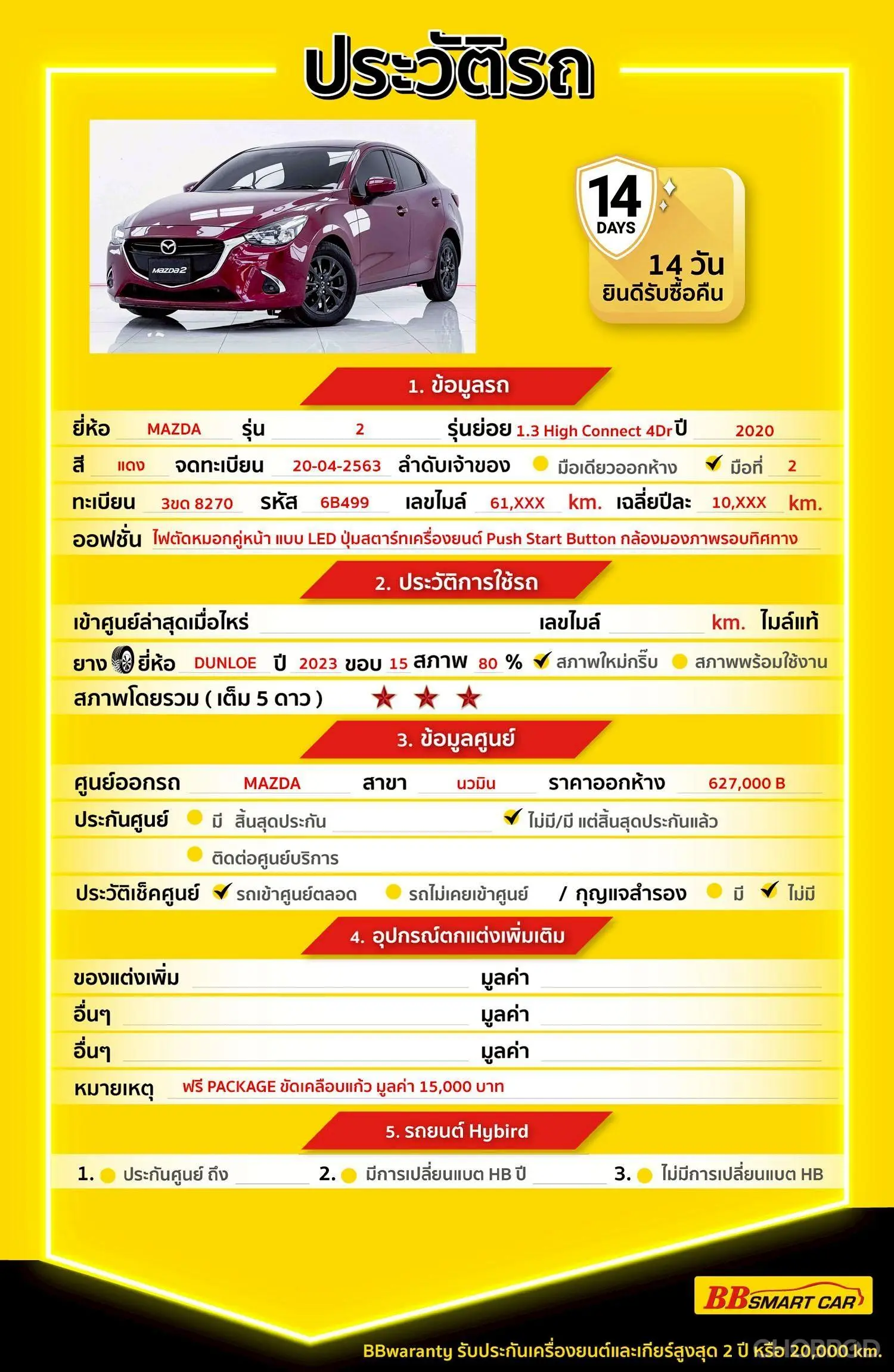 MAZDA 2 1.3 High Connect 4Dr AT 2020 ออกรถ 0 บาท รหัส 6B499 Line: ID @*******แสดงข้อมูล 🔥มีรถให้เลือกมากกว่า 1,800 คัน 🔥รถทุกคันผ่านตรวจสอบ Inspection เรียบแล้วค่ะ ผ่าน 5 ดาวทุกคันค่ะ 🔥ซื้อรถกับ BB พร้อมให้คำปรึกษา แก้ทุกปัญหา ให้ทุกเรื่อง บริการ call center 24 ชม. 🔥BB Care Plus รับประกันหลังการขาย สูงสุด 2 ปี หรือ 20,000 km. 🔥ฟรี!! แพคเก็จ ขัดเคลือบแก้ว มูลค่า 15,000 บาท ทุกคัน 🔥มี 6 สาขา ในกรุงเทพและปริมณฑลใกล้บ้านท่าน สาขา 6 ศูนย์รวมรถยนต์ไอคาร์สยาม กาญจนาภิเษก รหัสรถ 6B499 ราคา 349,000 บาท ผ่อนเพียง 6,010 บาท Brand. : MAZDA Year. : 2020 Model. : 2 Grade. : 1.3 High Connect 4Dr Engine. : 1,300 CC Type. : เบนซิน Gearbox : AT Color. : แดง Mileage. : 61,XXX KM. (ซื้อสด ราคานี้ยังไม่รวมค่าดำเนินการ 10,000 บ.) 🚩 Price. 349,000 บาท ยอดจัด : 359,000 บาท เงินดาวน์ : 0 บาท ประกันภัย : ฟรีประกันภัย 1 ปี ค่าดำเนินการ : 10,000 บาท รวมออกรถ : 0 บาท ผ่อน 36 งวด = 11,563 บาท ผ่อน 48 งวด = 8,896 บาท ผ่อน 60 งวด = 7,392 บาท ผ่อน 72 งวด = 6,613 บาท ผ่อน 84 งวด = 6,010 บาท เงื่อนไขเป็นไปตามที่ไฟแนนซ์กำหนด โปรโมชั่นพิเศษ สำหรับลูกค้าเครดิตดีลือกรับเรทดอกเบี้ยพิเศษ 📍36 งวด = 1.29 % 📍48 งวด = 1.99 % 📍60 งวด = 2.39 % 📍72 งวด = 3.59 % 🔥 เงื่อนไข โปรโมชั่น ดอกเบี้ยเริ่มต้น 1.29% ตลอดอายุสัญญา - ยอดจัดไฟแนนซ์ 300,000-600,000 บาท - ผ่อนสูงสุด 72 เดือน - เป็นลูกค้าประวัติดี พนักงานประจำเงินเดือน 20,000 ขึ้นไป - ค่าดำเนินการแคมเปญ 20,000 บาท (รวมในยอดจัดได้) 🎗Car Hightlight รถสวยๆ วันนี้ขอแนะนำ MAZDA 2 1.3 High Connect 4Dr AT 2020 จุดเด่นออฟชั่น 12.2.1 ::กระจังหน้า แบบโครเมียมรมดำ ไฟตัดหมอกคู่หน้า แบบ LED 12.2.2 ::ถุงลมนิรภัย 6 ตำแหน่ง (คู่หน้า-ด้านข้าง-ม่านนิรภัย) 12.2.3 ::ระบบเตือนมุมอับสายตา Blind Spot Warning ระบบเตือนเมื่อมีรถตัดผ่านขณะถอยหลัง RCTA 🎗ภายใน • กุญแจ Smart Keyless Entry ปุ่มสตาร์ทเครื่องยนต์ Push Start Button ระบบปรับอากาศแบบอัตโนมัติ พร้อมจอแสดงผลดิจิตอล ชุดมาตรวัดแบบเรืองแสง Optitron กล้องมองภาพรอบทิศทาง 360 องศา AVM หน้าจอเครื่องเสียง ระบบสัมผัส Touchscreen ขนาด 8 นิ้ว 🎗ภายนอก • กระจกมองข้างพับไฟฟ้า ล้อแม็ก ไฟเลี้ยวกระจกมองข้าง ไฟโปรเจคเตอร์ เซนเซอร์ถอยหลัง
