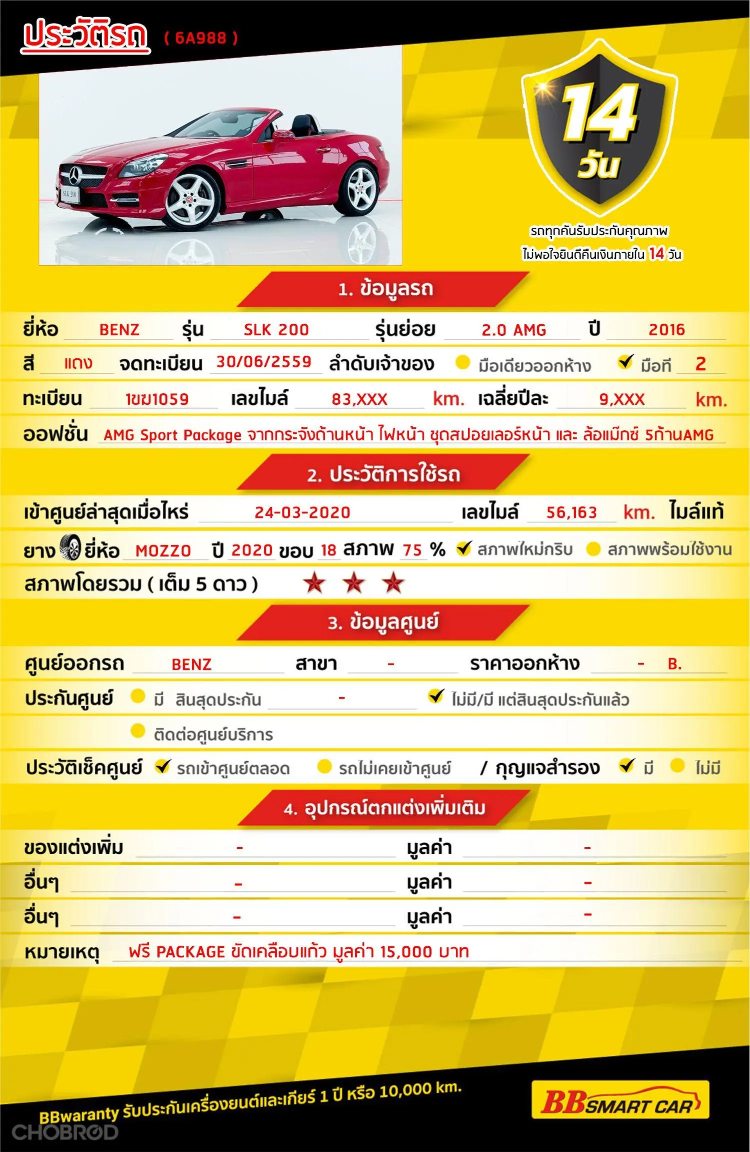 MERCEDES-BENZ SLK-CLASS SLK200 R172 AT 2016 ออกรถ 0 บาท จัดได้ 1,349,000 บ. Line:@*******แสดงข้อมูล 🔥จอง 199 บาท ส่งบัตรประชาชน รู้ผลพิจารณาภายใน 30 นาที ไม่ผ่านคืนเงินจองทุกกรณี 🔥ซื้อรถกับ BB พร้อมให้คำปรึกษา แก้ทุกปัญหา ให้ทุกเรื่อง บริการ call center 24 ชม. 🔥BB Care Plus รับประกันหลังการขาย สูงสุด 2 ปี หรือ 20,000 km.. 🔥มีรถให้เลือกมากกว่า 1,600 คัน สาขา 6 ศูนย์รวมรถยนต์ไอคาร์สยาม กาญจนาภิเษก รหัสรถ 6A988 ราคา 1,329,000 บาท ผ่อนเพียง 24,808 บาท Brand. : MERCEDES-BENZ Year. : 2016 Model. : SLK-CLASS Grade. : SLK200 R172 Engine. : 2,000 CC Type. : เบนซิน Gearbox : AT Color. : แดง Mileage. : 83,xxx KM. (ซื้อสด ราคานี้ยังไม่รวมค่าดำเนินการ 10,000 บ.) 🚩 Price. 1,329,000 บาท ยอดจัด : 1,339,000 บาท เงินดาวน์ : 0 บาท ประกันภัย : ฟรีประกันภัย 1 ปี ค่าดำเนินการ : 10,000 บาท รวมออกรถ : 0 บาท ผ่อน 36 = 45,770 บาท ผ่อน 48 = 35,523 บาท ผ่อน 60 = 29,621 บาท ผ่อน 72 = 26,629 บาท ผ่อน 84 = 24,808 บาท เงื่อนไขเป็นไปตามที่ไฟแนนซ์กำหนด โปรโมชั่นพิเศษ สำหรับลูกค้าเครดิตดี 🚩เลือกรับเรทดอกเบี้ยพิเศษ 📍36 งวด = 1.29 % 📍48 งวด = 1.99 % 📍60 งวด = 2.39 % 📍72 งวด = 3.59 % 🔥 เงื่อนไข โปรโมชั่น ดอกเบี้ยเริ่มต้น 1.29% ตลอดอายุสัญญา - ยอดจัดไฟแนนซ์ 300,000-600,0000 บาท - ผ่อนสูงสุด 72 เดือน - เป็นลูกค้าประวัติดี พนักงานประจำเงินเดือน 20,000 ขึ้นไป - ค่าดำเนินการแคมเปญ 20,000 บาท (รวมในยอดจัดได้) 🎗Car Hightlight รถสวยๆ วันนี้ขอแนะนำ MERCEDES-BENZ SLK-CLASS SLK200 R172 2016 ออฟชั่น 12.2.1 :AMG Sport Package จากกระจังด้านหน้า ไฟหน้า ชุดสปอยเลอร์หน้า และ ล้อแม๊กซ์ 5ก้านAMG ขนาด 18 นิ้ว 12.2.2 :เบาะไฟฟ้าเต็มตัวหุ้มหนังแท้สีดำเย็บโชว์ตะเข็บด้วยด้ายสีแดง +หน่วยบันทึกความจำ 3 ระดับ พร้อมเบลท์แดงเพิ่มความสปอร์ต 12.2.3 :เครื่องยนต์ของ Mercedes Benz SLK 200 AMG package R172 คือเครื่อง 2.0 ลิตร 4 กระบอกสูบ ให้แรงม้าสูงสุด 184 ตัว พร้อมเกียร์อัตโนมัติ 7 สปีด 🎗ภายใน พวงมาลัย Multifunction กระจกไฟฟ้า พวงมาลัยเพาเวอร์ เบรค ABS เซ็นทรัลล๊อก จอ LCD เล่น DVD กระจกมองข้างปรับไฟฟ้า Airbag เบาะไฟฟ้าคู่หน้า แอร์ AUTO 🎗ภายนอก ไฟโปรเจคเตอร์ ไฟตัดหมอก ไฟเลี้ยวกระจกมองข้าง ล้อแม็ก 🎗ความคุ้มค่า สำหรับคันนี้หากเปรียบเทียบราคากับคุณภาพ คันนี้ถือว่าคุ้มค่ามากค่ะ ผ่อนสบายๆก็มีรถขับได้ รถดีมีคุณภาพแบบนี้รีบตัดสินใจซื้อได้เลราคานี้มาไวไปไวนะคะ ⭐️การรับประกันหลังการขาย BB Care Plus สูงสุด 2 ปี หรือ 20,000 km. ด้วยช่างที่ผ่านการอบรมจากศูนย์ชั้นนำของประเทศ 🎉🎉Special offer เฉพาะ บีบีสมาร์ทคาร์ ที่นี่ที่เดียว ⭐️ ดอกเบี้ยเริ่มต้น 1.29% มีไฟแนนซ์รองรับหลายที่ค่ะ ⭐️ ฟรี!! แพคเก็จ ขัดเคลือบแก้ว มูลค่า 15,000 บาท ทุกคัน ⭐️ อนุมัติไว 30 นาที นำเอกสารมาให้ครบรับรถกลับบ้านทันทีค่ะ ⭐️ BB Care Plus รับประกันหลังการขาย สูงสุด 2 ปี หรือ 20,000 km. ⭐️ มี 6 สาขา ในกรุงเทพและปริมณฑลใกล้บ้านท่าน ⭐️ รถทุกคันผ่านตรวจสอบ Inspection เรียบแล้วค่ะ ผ่าน 5 ดาวทุกคันค่ะ ⭐️ เซลล์ทุกท่านเป็นมื