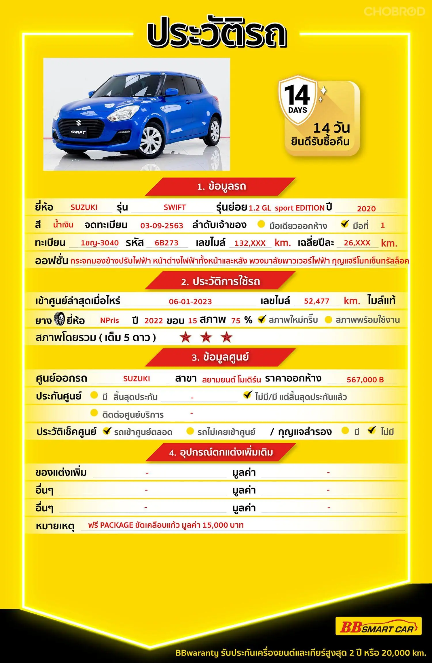 SUZUKI SWIFT 1.2 GL SPORT EDITION AT 2020 ออกรถ 0 บาท จัดได้ 334,000 บ. Line:@*******แสดงข้อมูล 🔥จอง 199 บาท ส่งบัตรประชาชน รู้ผลพิจารณาภายใน 30 นาที ไม่ผ่านคืนเงินจองทุกกรณี 🔥ซื้อรถกับ BB พร้อมให้คำปรึกษา แก้ทุกปัญหา ให้ทุกเรื่อง บริการ call center 24 ชม. 🔥BB Care Plus รับประกันหลังการขาย สูงสุด 2 ปี หรือ 20,000 km.. 🔥มีรถให้เลือกมากกว่า 1,800 คัน สาขา 6 ศูนย์รวมรถยนต์ไอคาร์สยาม กาญจนาภิเษก รหัสรถ 6B273 ราคา 314,000 บาท ผ่อนเพียง 5,927 บาท Brand. : SUZUKI Year. : 2020 Model. : SWIFT Grade. : 1.2 GL SPORT EDITION Engine. : 1,200 CC Type. : เบนซิน Gearbox : AT Color. : น้ำเงิน Mileage. : 132,xxx KM. (ซื้อสด ราคานี้ยังไม่รวมค่าดำเนินการ 10,000 บ.) 🚩 Price. 314,000 บาท ยอดจัด : 324,000 บาท เงินดาวน์ : 0 บาท ประกันภัย : ฟรีประกันภัย 1 ปี ค่าดำเนินการ : 10,000 บาท รวมออกรถ : 0 บาท ผ่อน 36 = 11,402 บาท ผ่อน 48 = 8,772 บาท ผ่อน 60 = 7,289 บาท ผ่อน 72 = 6,521 บาท ผ่อน 84 = 5,927 บาท เงื่อนไขเป็นไปตามที่ไฟแนนซ์กำหนด โปรโมชั่นพิเศษ สำหรับลูกค้าเครดิตดี 🚩เลือกรับเรทดอกเบี้ยพิเศษ 📍36 งวด = 1.29 % 📍48 งวด = 1.99 % 📍60 งวด = 2.39 % 📍72 งวด = 3.59 % 🔥 เงื่อนไข โปรโมชั่น ดอกเบี้ยเริ่มต้น 1.29% ตลอดอายุสัญญา - ยอดจัดไฟแนนซ์ 300,000-600,0000 บาท - ผ่อนสูงสุด 72 เดือน - เป็นลูกค้าประวัติดี พนักงานประจำเงินเดือน 20,000 ขึ้นไป - ค่าดำเนินการแคมเปญ 20,000 บาท (รวมในยอดจัดได้) 🎗Car Hightlight รถสวยๆ วันนี้ขอแนะนำ SUZUKI SWIFT 1.2 GL SPORT EDITION ออฟชั่น 12.2.1 : ดีไซน์สปอร์ต มีชุดแต่งรอบคัน + สปอยเลอร์ ดูโดดเด่นกว่ารุ่นปกติ 12.2.2 : ประหยัดน้ำมัน เครื่องยนต์ 1.2 ลิตร + เกียร์ CVT รองรับ ECO Car 12.2.3 : อุปกรณ์ครบ พวงมาลัยมัลติฟังก์ชัน, กระจกไฟฟ้า, ถุงลมคู่หน้า, ABS/EBD 🎗ภายใน เบรค ABS เซ็นทรัลล๊อก เบาะผ้า แอร์ กระจกไฟฟ้า Airbag วิทยุ - CD พวงมาลัยเพาเวอร์ 🎗ภายนอก ไฟตัดหมอก กระจกมองข้างปรับไฟฟ้า 🎗ความคุ้มค่า สำหรับคันนี้หากเปรียบเทียบราคากับคุณภาพ คันนี้ถือว่าคุ้มค่ามากค่ะ ผ่อนสบายๆก็มีรถขับได้ รถดีมีคุณภาพแบบนี้รีบตัดสินใจซื้อได้เลราคานี้มาไวไปไวนะคะ ⭐️การรับประกันหลังการขาย BB Care Plus สูงสุด 2 ปี หรือ 20,000 km. ด้วยช่างที่ผ่านการอบรมจากศูนย์ชั้นนำของประเทศ 🎉🎉Special offer เฉพาะ บีบีสมาร์ทคาร์ ที่นี่ที่เดียว ⭐️ ดอกเบี้ยเริ่มต้น 1.29% มีไฟแนนซ์รองรับหลายที่ค่ะ ⭐️ ฟรี!! แพคเก็จ ขัดเคลือบแก้ว มูลค่า 15,000 บาท ทุกคัน ⭐️ อนุมัติไว 30 นาที นำเอกสารมาให้ครบรับรถกลับบ้านทันทีค่ะ ⭐️ BB Care Plus รับประกันหลังการขาย สูงสุด 2 ปี หรือ 20,000 km. ⭐️ มี 6 สาขา ในกรุงเทพและปริมณฑลใกล้บ้านท่าน ⭐️ รถทุกคันผ่านตรวจสอบ Inspection เรียบแล้วค่ะ ผ่าน 5 ดาวทุกคันค่ะ ⭐️ เซลล์ทุกท่านเป็นมืออาชีพพร้อมให้บริการทุกท่านแน่นอนค่ะ