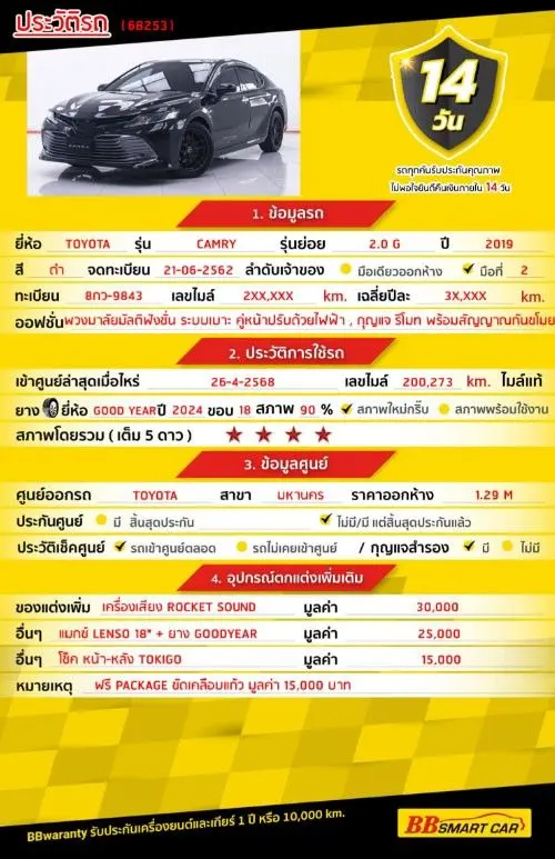TOYOTA CAMRY 2.0 G AT 2019 ออกรถ 0 บาท จัดได้ 659,000 บ. Line:@bbcar06 🔥จอง 199 บาท ส่งบัตรประชาชน รู้ผลพิจารณาภายใน 30 นาที ไม่ผ่านคืนเงินจองทุกกรณี 🔥ซื้อรถกับ BB พร้อมให้คำปรึกษา แก้ทุกปัญหา ให้ทุกเรื่อง บริการ call center 24 ชม. 🔥BB Care Plus รับประกันหลังการขาย สูงสุด 2 ปี หรือ 20,000 km.. 🔥มีรถให้เลือกมากกว่า 1,600 คัน สาขา 6 ศูนย์รวมรถยนต์ไอคาร์สยาม กาญจนาภิเษก รหัสรถ 6B253 ราคา 639,000 บาท ผ่อนเพียง 10,866 บาท Brand. : TOYOTA Year. : 2019 Model. : CAMRY Grade. : 2.0 G Engine. : 2,000 CC Type. : เบนซิน Gearbox : AT Color. : ดำ Mileage. : 208,xxx KM. (ซื้อสด ราคานี้ยังไม่รวมค่าดำเนินการ 10,000 บ.) 🚩 Price. 639,000 บาท ยอดจัด : 649,000 บาท เงินดาวน์ : 0 บาท ประกันภัย : ฟรีประกันภัย 1 ปี ค่าดำเนินการ : 10,000 บาท รวมออกรถ : 0 บาท ผ่อน 36 = 20,905 บาท ผ่อน 48 = 16,082 บาท ผ่อน 60 = 13,362 บาท ผ่อน 72 = 11,954 บาท ผ่อน 84 = 10,866 บาท เงื่อนไขเป็นไปตามที่ไฟแนนซ์กำหนด โปรโมชั่นพิเศษ สำหรับลูกค้าเครดิตดี 🚩เลือกรับเรทดอกเบี้ยพิเศษ 📍36 งวด = 1.29 % 📍48 งวด = 1.99 % 📍60 งวด = 2.39 % 📍72 งวด = 3.59 % 🔥 เงื่อนไข โปรโมชั่น ดอกเบี้ยเริ่มต้น 1.29% ตลอดอายุสัญญา - ยอดจัดไฟแนนซ์ 300,000-600,0000 บาท - ผ่อนสูงสุด 72 เดือน - เป็นลูกค้าประวัติดี พนักงานประจำเงินเดือน 20,000 ขึ้นไป - ค่าดำเนินการแคมเปญ 20,000 บาท (รวมในยอดจัดได้) 🎗Car Hightlight รถสวยๆ วันนี้ขอแนะนำ TOYOTA CAMRY 2.0 G AT 2019 ออฟชั่น 12.2.1 : พวงมาลัยมัลติฟังชั่น 12.2.2 :โคมไฟหน้า และโคมไฟท้ายแบบ Smoke Chrome 12.2.3 :เครื่องเล่น DVD 1 แผ่น หน้าจอแบบสัมผัส พร้อมช่องต่อ AUX 🎗ภายใน พวงมาลัย Multifunction เบาะหนัง กุญแจรีโมท-สัญญานกันขโมย จอ LCD เล่น DVD Airbag เบรค ABS แอร์ กระจกไฟฟ้า เซ็นทรัลล๊อก เบาะไฟฟ้าคนขับ กระจกมองข้างปรับไฟฟ้า วิทยุ - CD 🎗ภายนอก กระจกมองข้างพับไฟฟ้า ล้อแม็ก กล้องส่องหลัง ไฟตัดหมอก ไฟโปรเจคเตอร์ ไฟเลี้ยวกระจกมองข้าง 🎗ความคุ้มค่า สำหรับคันนี้หากเปรียบเทียบราคากับคุณภาพ คันนี้ถือว่าคุ้มค่ามากค่ะ ผ่อนสบายๆก็มีรถขับได้ รถดีมีคุณภาพแบบนี้รีบตัดสินใจซื้อได้เลราคานี้มาไวไปไวนะคะ ⭐️การรับประกันหลังการขาย BB Care Plus สูงสุด 2 ปี หรือ 20,000 km. ด้วยช่างที่ผ่านการอบรมจากศูนย์ชั้นนำของประเทศ 🎉🎉Special offer เฉพาะ บีบีสมาร์ทคาร์ ที่นี่ที่เดียว ⭐️ ดอกเบี้ยเริ่มต้น 1.29% มีไฟแนนซ์รองรับหลายที่ค่ะ ⭐️ ฟรี!! แพคเก็จ ขัดเคลือบแก้ว มูลค่า 15,000 บาท ทุกคัน ⭐️ อนุมัติไว 30 นาที นำเอกสารมาให้ครบรับรถกลับบ้านทันทีค่ะ ⭐️ BB Care Plus รับประกันหลังการขาย สูงสุด 2 ปี หรือ 20,000 km. ⭐️ มี 6 สาขา ในกรุงเทพและปริมณฑลใกล้บ้านท่าน ⭐️ รถทุกคันผ่านตรวจสอบ Inspection เรียบแล้วค่ะ ผ่าน 5 ดาวทุกคันค่ะ ⭐️ เซลล์ทุกท่านเป็นมืออาชีพพร้อมให้บริการทุกท่านแน่นอนค่ะ