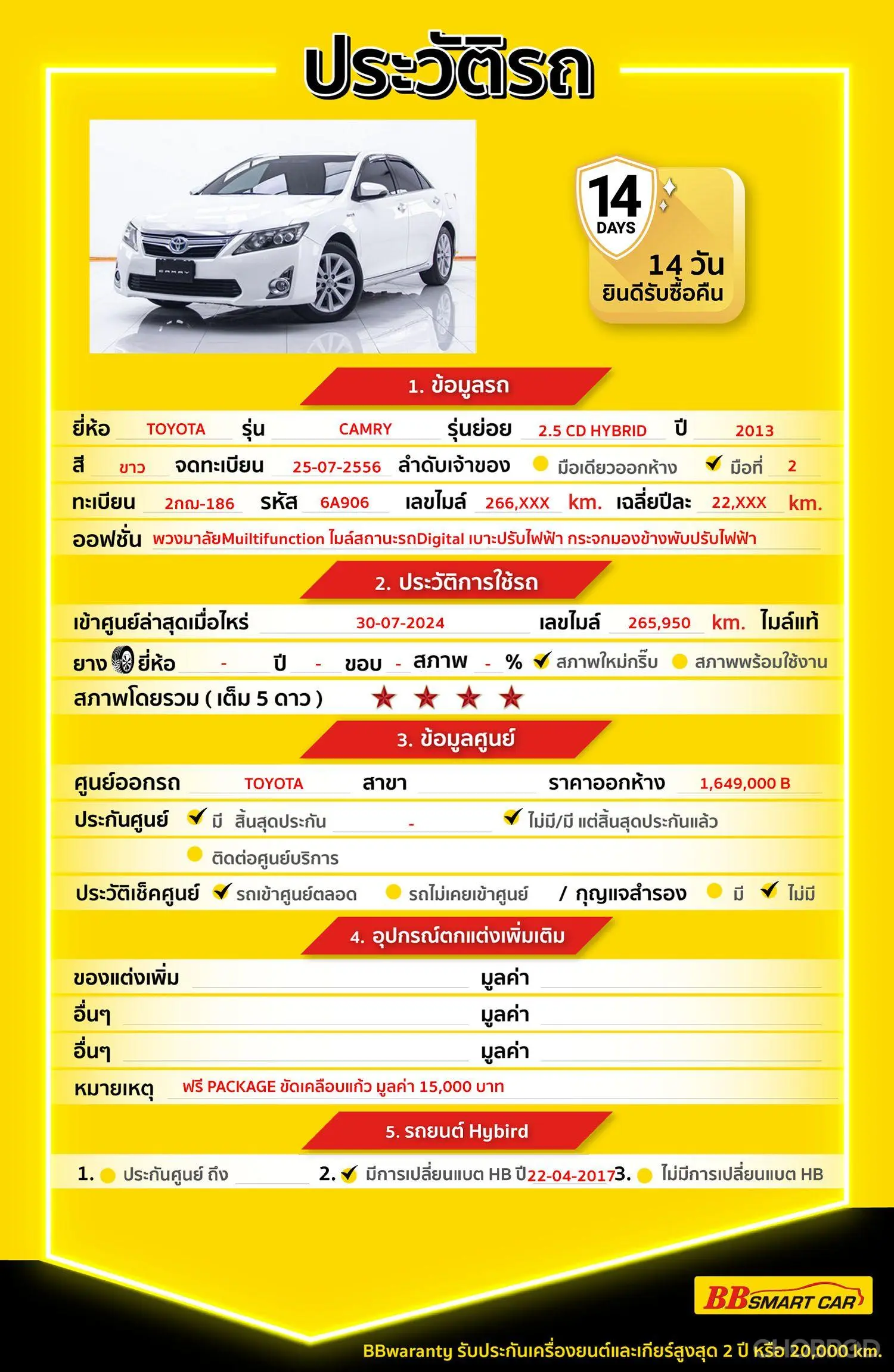 TOYOTA CAMRY 2.5 CD HYBRID 2013 ออกรถ 0 บาท จัดได้ 369,000 บ. Line:@*******แสดงข้อมูล 🔥จอง 199 บาท ส่งบัตรประชาชน รู้ผลพิจารณาภายใน 30 นาที ไม่ผ่านคืนเงินจองทุกกรณี 🔥ซื้อรถกับ BB พร้อมให้คำปรึกษา แก้ทุกปัญหา ให้ทุกเรื่อง บริการ call center 24 ชม. 🔥BB Care Plus รับประกันหลังการขาย สูงสุด 2 ปี หรือ 20,000 km.. 🔥มีรถให้เลือกมากกว่า 1,800 คัน สาขา 6 ศูนย์รวมรถยนต์ไอคาร์สยาม กาญจนาภิเษก รหัสรถ 6A906 ราคา 349,000 บาท ผ่อนเพียง 6,585 บาท Brand. : TOYOTA Year. : 2013 Model. : CAMRY Grade. : 2.5 CD HYBRID Engine. : 2,500 CC Type. : เบนซิน,ระบบไฟฟ้า Gearbox : AT Color. : ขาว Mileage. : 266,xxx KM. (ซื้อสด ราคานี้ยังไม่รวมค่าดำเนินการ 10,000 บ.) 🚩 Price. 349,000 บาท ยอดจัด : 359,000 บาท เงินดาวน์ : 0 บาท ประกันภัย : ฟรีประกันภัย 1 ปี ค่าดำเนินการ : 10,000 บาท รวมออกรถ : 0 บาท ผ่อน 36 = 11,663 บาท ผ่อน 48 = 9,144 บาท ผ่อน 60 = 7,859 บาท ผ่อน 72 = 7,003 บาท ผ่อน 84 = 6,585 บาท เงื่อนไขเป็นไปตามที่ไฟแนนซ์กำหนด โปรโมชั่นพิเศษ สำหรับลูกค้าเครดิตดี 🚩เลือกรับเรทดอกเบี้ยพิเศษ 📍36 งวด = 1.29 % 📍48 งวด = 1.99 % 📍60 งวด = 2.39 % 📍72 งวด = 3.59 % 🔥 เงื่อนไข โปรโมชั่น ดอกเบี้ยเริ่มต้น 1.29% ตลอดอายุสัญญา - ยอดจัดไฟแนนซ์ 300,000-600,0000 บาท - ผ่อนสูงสุด 72 เดือน - เป็นลูกค้าประวัติดี พนักงานประจำเงินเดือน 20,000 ขึ้นไป - ค่าดำเนินการแคมเปญ 20,000 บาท (รวมในยอดจัดได้) 🎗Car Hightlight รถสวยๆ วันนี้ขอแนะนำ TOYOTA CAMRY 2.5 CD HYBRID AT สีขาว เบนซิน+ไฟฟ้า ออฟชั่น 12.2.1 : พวงมาลัยMuiltifunction 12.2.2 : ไมล์สถานะรถDigital 12.2.3 :เบาะปรับไฟฟ้า 🎗ภายใน เบาะไฟฟ้าคู่หน้า พวงมาลัย Multifunction เบรค ABS วิทยุ - CD Airbag แอร์ เซ็นทรัลล๊อก กระจกไฟฟ้า 🎗ภายนอก กุญแจรีโมท-สัญญานกันขโมย 🎗ความคุ้มค่า สำหรับคันนี้หากเปรียบเทียบราคากับคุณภาพ คันนี้ถือว่าคุ้มค่ามากค่ะ ผ่อนสบายๆก็มีรถขับได้ รถดีมีคุณภาพแบบนี้รีบตัดสินใจซื้อได้เลราคานี้มาไวไปไวนะคะ ⭐️การรับประกันหลังการขาย BB Care Plus สูงสุด 2 ปี หรือ 20,000 km. ด้วยช่างที่ผ่านการอบรมจากศูนย์ชั้นนำของประเทศ 🎉🎉Special offer เฉพาะ บีบีสมาร์ทคาร์ ที่นี่ที่เดียว ⭐️ ดอกเบี้ยเริ่มต้น 1.29% มีไฟแนนซ์รองรับหลายที่ค่ะ ⭐️ ฟรี!! แพคเก็จ ขัดเคลือบแก้ว มูลค่า 15,000 บาท ทุกคัน ⭐️ อนุมัติไว 30 นาที นำเอกสารมาให้ครบรับรถกลับบ้านทันทีค่ะ ⭐️ BB Care Plus รับประกันหลังการขาย สูงสุด 2 ปี หรือ 20,000 km. ⭐️ มี 6 สาขา ในกรุงเทพและปริมณฑลใกล้บ้านท่าน ⭐️ รถทุกคันผ่านตรวจสอบ Inspection เรียบแล้วค่ะ ผ่าน 5 ดาวทุกคันค่ะ ⭐️ เซลล์ทุกท่านเป็นมืออาชีพพร้อมให้บริการทุกท่านแน่นอนค่ะ