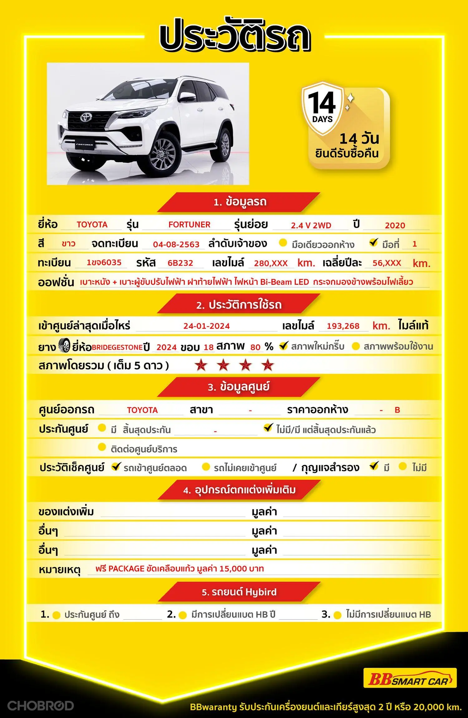 มีการรับประกันจากดีลเลอร์ (6 เดือน) มีบริการช่วยเหลือฉุกเฉินบนท้องถนน 24 ชม. จากดีลเลอร์