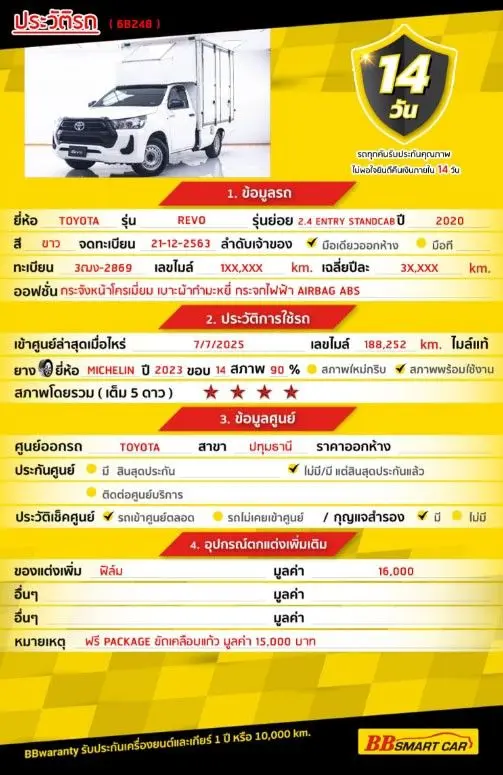 มีการรับประกันจากดีลเลอร์ (6 เดือน) มีบริการช่วยเหลือฉุกเฉินบนท้องถนน 24 ชม. จากดีลเลอร์