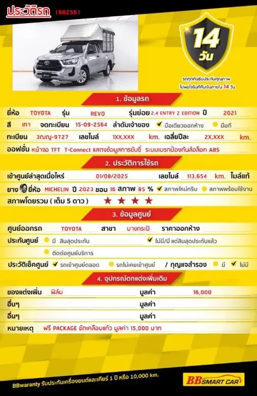 มีการรับประกันจากดีลเลอร์ (6 เดือน) มีบริการช่วยเหลือฉุกเฉินบนท้องถนน 24 ชม. จากดีลเลอร์