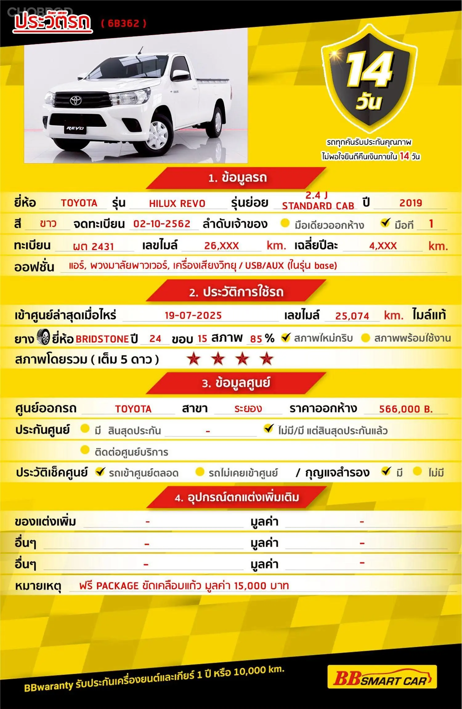 TOYOTA HILUX REVO 2.4 J STANDARD CAB MT 2019 ออกรถ 0 บาท จัดได้ 409,000 บ. Line:@bbcar06 🔥จอง 199 บาท ส่งบัตรประชาชน รู้ผลพิจารณาภายใน 30 นาที ไม่ผ่านคืนเงินจองทุกกรณี 🔥ซื้อรถกับ BB พร้อมให้คำปรึกษา แก้ทุกปัญหา ให้ทุกเรื่อง บริการ call center 24 ชม. 🔥BB Care Plus รับประกันหลังการขาย สูงสุด 2 ปี หรือ 20,000 km.. 🔥มีรถให้เลือกมากกว่า 1,800 คัน สาขา 6 ศูนย์รวมรถยนต์ไอคาร์สยาม กาญจนาภิเษก รหัสรถ 6B362 ราคา 389,000 บาท ผ่อนเพียง 6,965 บาท Brand. : TOYOTA Year. : 2019 Model. : HILUX REVO Grade. :2.4 J STANDARD CAB Engine. : 2,400 CC Type. : ดีเซล Gearbox : MT Color. : ขาว Mileage. : 26,xxx KM. (ซื้อสด ราคานี้ยังไม่รวมค่าดำเนินการ 10,000 บ.) 🚩 Price. 389,000 บาท ยอดจัด : 399,000 บาท เงินดาวน์ : 0 บาท ประกันภัย : ฟรีประกันภัย 1 ปี ค่าดำเนินการ : 10,000 บาท รวมออกรถ : 0 บาท ผ่อน 36 = 13,172 บาท ผ่อน 48 = 10,207 บาท ผ่อน 60 = 8,499 บาท ผ่อน 72 = 7,633 บาท ผ่อน 84 = 6,965 บาท เงื่อนไขเป็นไปตามที่ไฟแนนซ์กำหนด โปรโมชั่นพิเศษ สำหรับลูกค้าเครดิตดี 🚩เลือกรับเรทดอกเบี้ยพิเศษ 📍36 งวด = 2.59 % 📍48 งวด = 2.89 % 📍60 งวด = 3.29 % 📍72 งวด = 4.49 % 🔥 เงื่อนไข โปรโมชั่น ดอกเบี้ยเริ่มต้น 1.29% ตลอดอายุสัญญา - ยอดจัดไฟแนนซ์ 300,000-600,0000 บาท - ผ่อนสูงสุด 72 เดือน - เป็นลูกค้าประวัติดี พนักงานประจำเงินเดือน 20,000 ขึ้นไป - ค่าดำเนินการแคมเปญ 20,000 บาท (รวมในยอดจัดได้) 🎗Car Hightlight รถสวยๆ วันนี้ขอแนะนำ TOYOTA HILUX REVO 2.4 J STANDARD CAB MT 2019 ออฟชั่น 12.2.1 :เครื่องดีเซล 2.4 L 150 แรงม้า เกียร์ธรรมดา 6 สปีด 12.2.2 :ระบบเบรก ABS/EBD ถุงลมนิรภัยคู่หน้า 12.2.3 :แอร์ วิทยุ พวงมาลัยเพาเวอร์ ช่วงล่างแหนบแข็งแรง 🎗ภายใน เบาะหนัง กระจกไฟฟ้า เซ็นทรัลล๊อก พวงมาลัยเพาเวอร์ วิทยุ - CD แอร์ กระจกมองข้างปรับไฟฟ้า เบรค ABS Airbag 🎗ภายนอก แม็กลายเนอร์ 🎗ความคุ้มค่า สำหรับคันนี้หากเปรียบเทียบราคากับคุณภาพ คันนี้ถือว่าคุ้มค่ามากค่ะ ผ่อนสบายๆก็มีรถขับได้ รถดีมีคุณภาพแบบนี้รีบตัดสินใจซื้อได้เลราคานี้มาไวไปไวนะคะ ⭐️การรับประกันหลังการขาย BB Care Plus สูงสุด 2 ปี หรือ 20,000 km. ด้วยช่างที่ผ่านการอบรมจากศูนย์ชั้นนำของประเทศ 🎉🎉Special offer เฉพาะ บีบีสมาร์ทคาร์ ที่นี่ที่เดียว ⭐️ ดอกเบี้ยเริ่มต้น 2.59% มีไฟแนนซ์รองรับหลายที่ค่ะ ⭐️ ฟรี!! แพคเก็จ ขัดเคลือบแก้ว มูลค่า 15,000 บาท ทุกคัน ⭐️ อนุมัติไว 30 นาที นำเอกสารมาให้ครบรับรถกลับบ้านทันทีค่ะ ⭐️ BB Care Plus รับประกันหลังการขาย สูงสุด 2 ปี หรือ 20,000 km. ⭐️ มี 6 สาขา ในกรุงเทพและปริมณฑลใกล้บ้านท่าน ⭐️ รถทุกคันผ่านตรวจสอบ Inspection เรียบแล้วค่ะ ผ่าน 5 ดาวทุกคันค่ะ ⭐️ เซลล์ทุกท่านเป็นมืออาชีพพร้อมให้บริการทุกท่านแน่นอนค่ะ