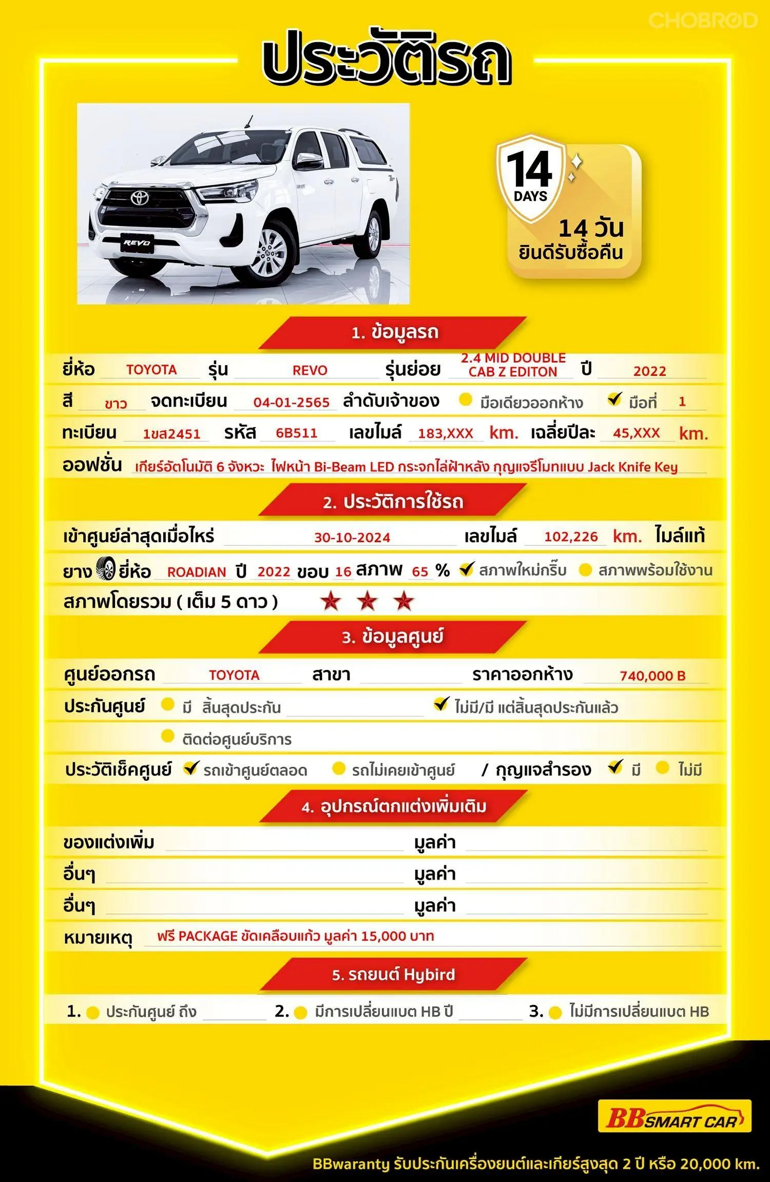 TOYOTA HILUX REVO 2.4 MID Z EDITION DOUBLE CAB AT 2022 ออกรถ 0 บาท รหัส 6B511 Line: ID @bbcar06 🔥มีรถให้เลือกมากกว่า 1,800 คัน 🔥รถทุกคันผ่านตรวจสอบ Inspection เรียบแล้วค่ะ ผ่าน 5 ดาวทุกคันค่ะ 🔥ซื้อรถกับ BB พร้อมให้คำปรึกษา แก้ทุกปัญหา ให้ทุกเรื่อง บริการ call center 24 ชม. 🔥BB Care Plus รับประกันหลังการขาย สูงสุด 2 ปี หรือ 20,000 km. 🔥ฟรี!! แพคเก็จ ขัดเคลือบแก้ว มูลค่า 15,000 บาท ทุกคัน 🔥มี 6 สาขา ในกรุงเทพและปริมณฑลใกล้บ้านท่าน สาขา 6 ศูนย์รวมรถยนต์ไอคาร์สยาม กาญจนาภิเษก รหัสรถ 6B511 ราคา 529,000 บาท ผ่อนเพียง 9,023 บาท Brand. : TOYOTA Year. : 2022 Model. : HILUX REVO Grade. : 2.4 MID Z EDITION DOUBLE CAB Engine. : 2,400 CC Type. : ดีเซล Gearbox : AT Color. : ขาว Mileage. : 183,XXX KM. (ซื้อสด ราคานี้ยังไม่รวมค่าดำเนินการ 10,000 บ.) 🚩 Price. 529,000 บาท ยอดจัด : 539,000 บาท เงินดาวน์ : 0 บาท ประกันภัย : ฟรีประกันภัย 1 ปี ค่าดำเนินการ : 10,000 บาท รวมออกรถ : 0 บาท ผ่อน 36 งวด = 17,361 บาท ผ่อน 48 งวด = 13,356 บาท ผ่อน 60 งวด = 11,097 บาท ผ่อน 72 งวด = 9,927 บาท ผ่อน 84 งวด = 9,023 บาท เงื่อนไขเป็นไปตามที่ไฟแนนซ์กำหนด โปรโมชั่นพิเศษ สำหรับลูกค้าเครดิตดีลือกรับเรทดอกเบี้ยพิเศษ 📍36 งวด = 1.29 % 📍48 งวด = 1.99 % 📍60 งวด = 2.39 % 📍72 งวด = 3.59 % 🔥 เงื่อนไข โปรโมชั่น ดอกเบี้ยเริ่มต้น 1.29% ตลอดอายุสัญญา - ยอดจัดไฟแนนซ์ 300,000-600,000 บาท - ผ่อนสูงสุด 72 เดือน - เป็นลูกค้าประวัติดี พนักงานประจำเงินเดือน 20,000 ขึ้นไป - ค่าดำเนินการแคมเปญ 20,000 บาท (รวมในยอดจัดได้) 🎗Car Hightlight รถสวยๆ วันนี้ขอแนะนำ TOYOTA HILUX REVO 2.4 MID Z EDITION DOUBLE CAB AT 2022 จุดเด่นออฟชั่น 1) ดีไซน์ Z-Edition เด่นทันทีที่มองเห็น กระจังหน้า, กันชน, มือเปิดประตู และกระจกมองข้าง ใช้สีดำเงา Gloss Black ให้ลุคสปอร์ต-ดุดันกว่าแบบมาตรฐาน พร้อมไฟหน้า Bi-Beam LED และไฟท้าย LED, ไฟตัดหมอกหน้า LED ซึ่งต่างจากรุ่น Entry ทั่วไปที่ใช้ฮาโลเจน 🎗ภายใน • ไมล์ Digital เบาะหนัง แอร์ กุญแจรีโมท-สัญญานกันขโมย Airbag พวงมาลัยเพาเวอร์ กระจกไฟฟ้า เบรค ABS พวงมาลัย Multifunction เซ็นทรัลล๊อก จอ LCD เล่น DVD 🎗ภายนอก • กระจกมองข้างปรับไฟฟ้า ล้อแม็ก กระจกมองข้างพับไฟฟ้า ไฟโปรเจคเตอร์ กระจกข้างโครเมี่ยม ไฟเลี้ยวกระจกมองข้าง 🎗ความคุ้มค่า สำหรับคันนี้หากเปรียบเทียบราคากับคุณภาพ คันนี้ถือว่าคุ้มค่ามากค่ะ ผ่อนสบายๆก็มีรถขับได้ รถดีมีคุณภาพแบบนี้รีบตัดสินใจซื้อได้เลราคานี้มาไวไปไวนะคะ