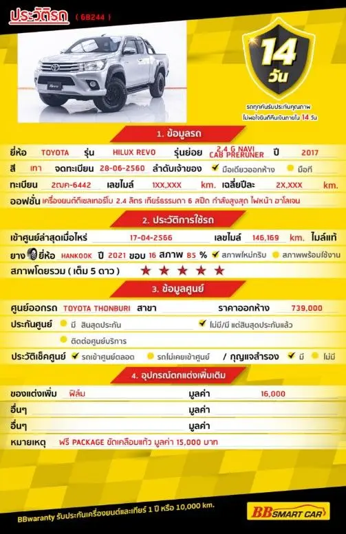 มีการรับประกันจากดีลเลอร์ (6 เดือน) มีบริการช่วยเหลือฉุกเฉินบนท้องถนน 24 ชม. จากดีลเลอร์