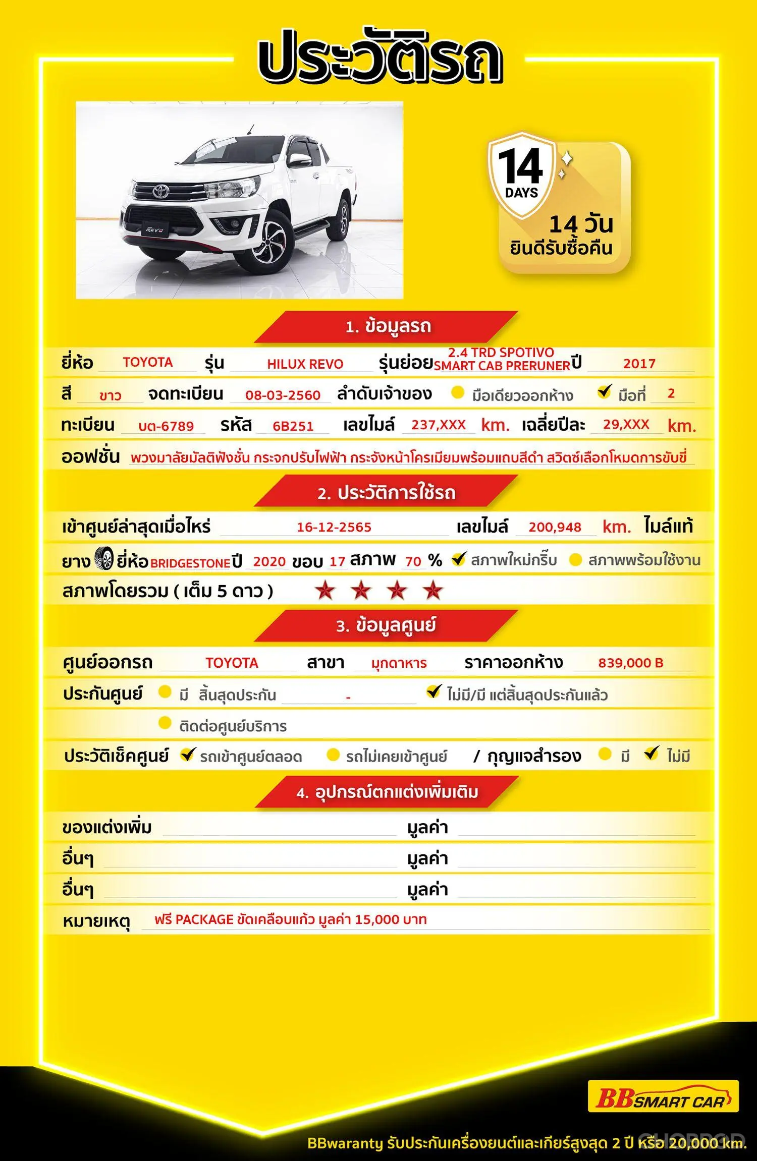 TOYOTA HILUX REVO 2.4 TRD SPOTIVO SMART CAB PRERUNER AT 2017 ออกรถ 0 บาท จัดได้ 479,000 บ. Line:@*******แสดงข้อมูล 🔥จอง 199 บาท ส่งบัตรประชาชน รู้ผลพิจารณาภายใน 30 นาที ไม่ผ่านคืนเงินจองทุกกรณี 🔥ซื้อรถกับ BB พร้อมให้คำปรึกษา แก้ทุกปัญหา ให้ทุกเรื่อง บริการ call center 24 ชม. 🔥BB Care Plus รับประกันหลังการขาย สูงสุด 2 ปี หรือ 20,000 km.. 🔥มีรถให้เลือกมากกว่า 1,800 คัน สาขา 6 ศูนย์รวมรถยนต์ไอคาร์สยาม กาญจนาภิเษก รหัสรถ 6B251 ราคา 459,000 บาท ผ่อนเพียง 8,959 บาท Brand. : TOYOTA Year. : 2017 Model. : HILUX REVO Grade. : 2.4 TRD SPOTIVO SMART CAB PRERUNER Engine. : 2,400 CC Type. : ดีเซล Gearbox : AT Color. : ขาว Mileage. : 237,xxx KM. (ซื้อสด ราคานี้ยังไม่รวมค่าดำเนินการ 10,000 บ.) 🚩 Price. 459,000 บาท ยอดจัด : 469,000 บาท เงินดาวน์ : 0 บาท ประกันภัย : ฟรีประกันภัย 1 ปี ค่าดำเนินการ : 10,000 บาท รวมออกรถ : 0 บาท ผ่อน 36 = 16,240 บาท ผ่อน 48 = 12,681 บาท ผ่อน 60 = 10,630 บาท ผ่อน 72 = 9,591 บาท ผ่อน 84 = 8,959 บาท เงื่อนไขเป็นไปตามที่ไฟแนนซ์กำหนด โปรโมชั่นพิเศษ สำหรับลูกค้าเครดิตดี 🚩เลือกรับเรทดอกเบี้ยพิเศษ 📍36 งวด = 2.59 % 📍48 งวด = 2.89 % 📍60 งวด = 3.29 % 📍72 งวด = 4.49 % 🔥 เงื่อนไข โปรโมชั่น ดอกเบี้ยเริ่มต้น 1.29% ตลอดอายุสัญญา - ยอดจัดไฟแนนซ์ 300,000-600,0000 บาท - ผ่อนสูงสุด 72 เดือน - เป็นลูกค้าประวัติดี พนักงานประจำเงินเดือน 20,000 ขึ้นไป - ค่าดำเนินการแคมเปญ 20,000 บาท (รวมในยอดจัดได้) 🎗Car Hightlight รถสวยๆ วันนี้ขอแนะนำ TOYOTA HILUX REVO 2.4 TRD SPOTIVO SMART CAB PRERUNER AT 2017 ออฟชั่น 12.2.1 : พวงมาลัยมัลติฟังชั่น 12.2.2 :กระจกปรับไฟฟ้า 12.2.3 :ชุดแต่ง TRD 🎗ภายใน กระจกไฟฟ้า Airbag เซ็นทรัลล๊อก วิทยุ - CD พวงมาลัย Multifunction เบรค ABS แอร์ 🎗ภายนอก ชุดแต่งสเกิร์ตรอบคัน 🎗ความคุ้มค่า สำหรับคันนี้หากเปรียบเทียบราคากับคุณภาพ คันนี้ถือว่าคุ้มค่ามากค่ะ ผ่อนสบายๆก็มีรถขับได้ รถดีมีคุณภาพแบบนี้รีบตัดสินใจซื้อได้เลราคานี้มาไวไปไวนะคะ ⭐️การรับประกันหลังการขาย BB Care Plus สูงสุด 2 ปี หรือ 20,000 km. ด้วยช่างที่ผ่านการอบรมจากศูนย์ชั้นนำของประเทศ 🎉🎉Special offer เฉพาะ บีบีสมาร์ทคาร์ ที่นี่ที่เดียว ⭐️ ดอกเบี้ยเริ่มต้น 2.59% มีไฟแนนซ์รองรับหลายที่ค่ะ ⭐️ ฟรี!! แพคเก็จ ขัดเคลือบแก้ว มูลค่า 15,000 บาท ทุกคัน ⭐️ อนุมัติไว 30 นาที นำเอกสารมาให้ครบรับรถกลับบ้านทันทีค่ะ ⭐️ BB Care Plus รับประกันหลังการขาย สูงสุด 2 ปี หรือ 20,000 km. ⭐️ มี 6 สาขา ในกรุงเทพและปริมณฑลใกล้บ้านท่าน ⭐️ รถทุกคันผ่านตรวจสอบ Inspection เรียบแล้วค่ะ ผ่าน 5 ดาวทุกคันค่ะ ⭐️ เซลล์ทุกท่านเป็นมืออาชีพพร้อมให้บริการทุกท่านแน่นอนค่ะ