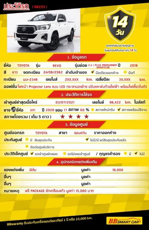 มีการรับประกันจากดีลเลอร์ (6 เดือน) มีบริการช่วยเหลือฉุกเฉินบนท้องถนน 24 ชม. จากดีลเลอร์