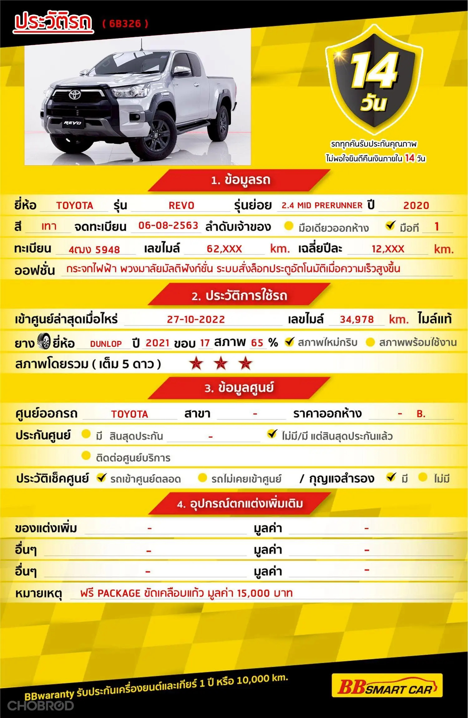 มีการรับประกันจากดีลเลอร์ (6 เดือน) มีบริการช่วยเหลือฉุกเฉินบนท้องถนน 24 ชม. จากดีลเลอร์