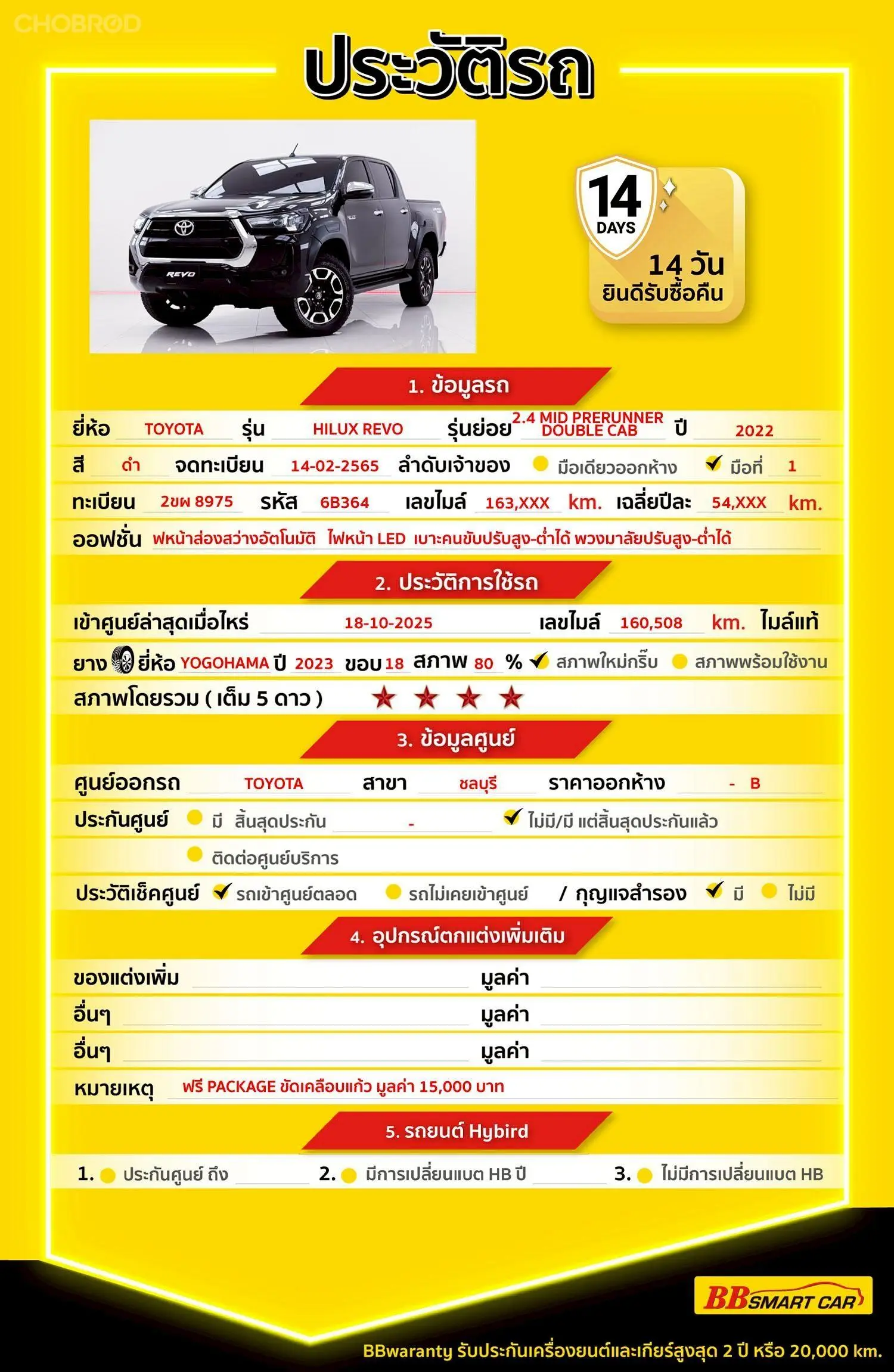TOYOTA HILUX REVO 2.4 MID PRERUNNER DOUBLE CAB AT 2022 ออกรถ 0 บาท จัดได้ 614,000 บ. Line:@*******แสดงข้อมูล 🔥จอง 199 บาท ส่งบัตรประชาชน รู้ผลพิจารณาภายใน 30 นาที ไม่ผ่านคืนเงินจองทุกกรณี 🔥ซื้อรถกับ BB พร้อมให้คำปรึกษา แก้ทุกปัญหา ให้ทุกเรื่อง บริการ call center 24 ชม. 🔥BB Care Plus รับประกันหลังการขาย สูงสุด 2 ปี หรือ 20,000 km.. 🔥มีรถให้เลือกมากกว่า 1,800 คัน สาขา 6 ศูนย์รวมรถยนต์ไอคาร์สยาม กาญจนาภิเษก รหัสรถ 6B364 ราคา 594,000 บาท ผ่อนเพียง 10,698 บาท Brand. : TOYOTA Year. : 2022 Model. : HILUX REVO Grade. : 2.4 MID PRERUNNER DOUBLE CAB Engine. : 2,400 CC Type. : ดีเซล Gearbox : AT Color. : ดำ Mileage. : 163,xxx KM. (ซื้อสด ราคานี้ยังไม่รวมค่าดำเนินการ 10,000 บ.) 🚩 Price. 594,000 บาท ยอดจัด : 604,000 บาท เงินดาวน์ : 0 บาท ประกันภัย : ฟรีประกันภัย 1 ปี ค่าดำเนินการ : 10,000 บาท รวมออกรถ : 0 บาท ผ่อน 36 = 19,728 บาท ผ่อน 48 = 15,834 บาท ผ่อน 60 = 13,156 บาท ผ่อน 72 = 11,770 บาท ผ่อน 84 = 10,698 บาท เงื่อนไขเป็นไปตามที่ไฟแนนซ์กำหนด โปรโมชั่นพิเศษ สำหรับลูกค้าเครดิตดี 🚩เลือกรับเรทดอกเบี้ยพิเศษ 📍36 งวด = 1.29 % 📍48 งวด = 1.99 % 📍60 งวด = 2.39 % 📍72 งวด = 3.59 % 🔥 เงื่อนไข โปรโมชั่น ดอกเบี้ยเริ่มต้น 1.29% ตลอดอายุสัญญา - ยอดจัดไฟแนนซ์ 300,000-600,0000 บาท - ผ่อนสูงสุด 72 เดือน - เป็นลูกค้าประวัติดี พนักงานประจำเงินเดือน 20,000 ขึ้นไป - ค่าดำเนินการแคมเปญ 20,000 บาท (รวมในยอดจัดได้) 🎗Car Hightlight รถสวยๆ วันนี้ขอแนะนำ TOYOTA HILUX REVO 2.4 MID PRERUNNER DOUBLE CAB AT 2022 ออฟชั่น 12.2.1 : ไฟหน้าส่องสว่างอัตโนมัติ (เปิด-ปิด อัตโนมัติ พร้อมระบบ Follow-me-home) 12.2.2 : ไฟหน้า LED (Bi-Beam) ไฟท้าย LED (Light Guiding) 12.2.3 เสาอากาศ (แบบสั้น) 🎗ภายใน พวงมาลัยเพาเวอร์ กระจกมองข้างปรับไฟฟ้า เบาะไฟฟ้าคนขับ เซ็นทรัลล๊อก พวงมาลัย Multifunction จอ LCD เล่น DVD Airbag เบรค ABS แอร์ 🎗ภายนอก กระจกไฟฟ้า แม็กลายเนอร์ ไฟโปรเจคเตอร์ บันไดข้าง ล้อแม็ก ไฟตัดหมอก ไฟเลี้ยวกระจกมองข้าง คิ้วกันสาด กระจกข้างโครเมี่ยม 🎗ความคุ้มค่า สำหรับคันนี้หากเปรียบเทียบราคากับคุณภาพ คันนี้ถือว่าคุ้มค่ามากค่ะ ผ่อนสบายๆก็มีรถขับได้ รถดีมีคุณภาพแบบนี้รีบตัดสินใจซื้อได้เลราคานี้มาไวไปไวนะคะ ⭐️การรับประกันหลังการขาย BB Care Plus สูงสุด 2 ปี หรือ 20,000 km. ด้วยช่างที่ผ่านการอบรมจากศูนย์ชั้นนำของประเทศ 🎉🎉Special offer เฉพาะ บีบีสมาร์ทคาร์ ที่นี่ที่เดียว ⭐️ ดอกเบี้ยเริ่มต้น 1.29% มีไฟแนนซ์รองรับหลายที่ค่ะ ⭐️ ฟรี!! แพคเก็จ ขัดเคลือบแก้ว มูลค่า 15,000 บาท ทุกคัน ⭐️ อนุมัติไว 30 นาที นำเอกสารมาให้ครบรับรถกลับบ้านทันทีค่ะ ⭐️ BB Care Plus รับประกันหลังการขาย สูงสุด 2 ปี หรือ 20,000 km. ⭐️ มี 6 สาขา ในกรุงเทพและปริมณฑลใกล้บ้านท่าน ⭐️ รถทุกคันผ่านตรวจสอบ Inspection เรียบแล้วค่ะ ผ่าน 5 ดาวทุกคันค่ะ ⭐️ เซลล์ทุกท่านเป็นมืออาชีพพร้อมให้บริการทุกท่านแน่นอนค่ะ