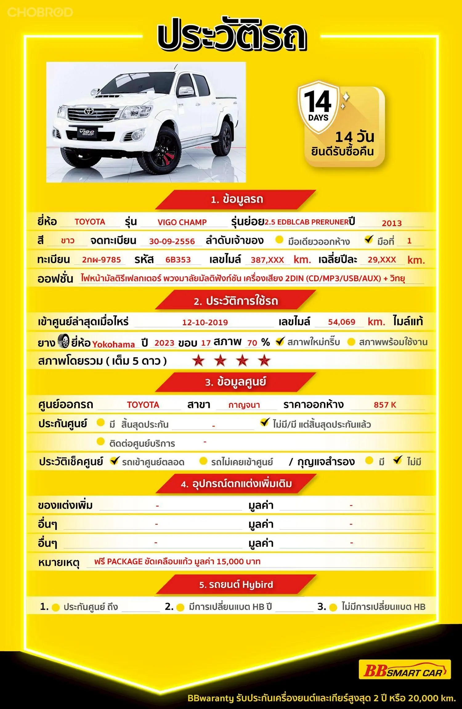 TOYOTA VIGO CHAMP 2.5 E DBL CAB PRERUNER AT 2013 ออกรถ 0 บาท รหัส 6B535 Line: ID @bbcar06 🔥มีรถให้เลือกมากกว่า 1,800 คัน 🔥รถทุกคันผ่านตรวจสอบ Inspection เรียบแล้วค่ะ ผ่าน 5 ดาวทุกคันค่ะ 🔥ซื้อรถกับ BB พร้อมให้คำปรึกษา แก้ทุกปัญหา ให้ทุกเรื่อง บริการ call center 24 ชม. 🔥BB Care Plus รับประกันหลังการขาย สูงสุด 2 ปี หรือ 20,000 km. 🔥ฟรี!! แพคเก็จ ขัดเคลือบแก้ว มูลค่า 15,000 บาท ทุกคัน 🔥มี 6 สาขา ในกรุงเทพและปริมณฑลใกล้บ้านท่าน สาขา 6 ศูนย์รวมรถยนต์ไอคาร์สยาม กาญจนาภิเษก รหัสรถ 6B535 ราคา 359,000 บาท ผ่อนเพียง 7,168 บาท Brand. : TOYOTA Year. : 2013 Model. : VIGO CHAMP Grade. :2.5 E DBL CAB PRERUNERI Engine. : 2,500 CC Type. : ขาว Gearbox : AT Color. : น้ำเงิน Mileage. : 387,XXX KM. (ซื้อสด ราคานี้ยังไม่รวมค่าดำเนินการ 10,000 บ.) 🚩 Price. 359,000 บาท ยอดจัด : 369,000 บาท เงินดาวน์ : 0 บาท ประกันภัย : ฟรีประกันภัย 1 ปี ค่าดำเนินการ : 10,000 บาท รวมออกรถ : 0 บาท ผ่อน 36 งวด = 12,694 บาท ผ่อน 48 งวด = 9,953 บาท ผ่อน 60 งวด = 8,555 บาท ผ่อน 72 งวด = 7,623 บาท ผ่อน 84 งวด = 7,168 บาท เงื่อนไขเป็นไปตามที่ไฟแนนซ์กำหนด โปรโมชั่นพิเศษ สำหรับลูกค้าเครดิตดีลือกรับเรทดอกเบี้ยพิเศษ 📍36 งวด = 1.29 % 📍48 งวด = 1.99 % 📍60 งวด = 2.39 % 📍72 งวด = 3.59 % 🔥 เงื่อนไข โปรโมชั่น ดอกเบี้ยเริ่มต้น 1.29% ตลอดอายุสัญญา - ยอดจัดไฟแนนซ์ 300,000-600,000 บาท - ผ่อนสูงสุด 72 เดือน - เป็นลูกค้าประวัติดี พนักงานประจำเงินเดือน 20,000 ขึ้นไป - ค่าดำเนินการแคมเปญ 20,000 บาท (รวมในยอดจัดได้) 🎗Car Hightlight รถสวยๆ วันนี้ขอแนะนำ TOYOTA VIGO CHAMP 2.5 E DBL CAB PRERUNER AT 2013 จุดเด่นออฟชั่น 12.2.1 :เครื่องยนต์ ดีเซล 2.5 ลิตร ให้แรงบิดสูง ประหยัดน้ำมัน เหมาะกับงานหนัก-เบา พร้อม เกียร์อัตโนมัติ ใช้ง่ายในเมืองและต่างจังหวัด 12.2.2 :นั่งสบายได้ถึง 5 ที่นั่งจริง ทั้งขับ-ทั้งโดยสาร — เหมาะทั้งงานและครอบครัว 12.2.3 :ระบบช่วงล่างสูงขึ้นเล็กน้อย พร้อมขับเคลื่อน ล้อหลัง ให้การทรงตัวและการบรรทุกดี บนพื้นผิวที่หลากหลาย 🎗ภายใน เบาะนั่ง 5 ที่นั่ง (ค็อกพิต 4 ประตู) พวงมาลัยมัลติฟังก์ชัน (มีปุ่มควบคุมเครื่องเสียง/โทรศัพท์) เครื่องเสียง 2DIN (CD/MP3/USB/AUX) + วิทยุ พร้อมลำโพงหลายตำแหน่ง หน้าจอสัมผัสในบางรุ่นที่ติดตั้งเพิ่มได้ ช่องเชื่อมต่อ USB/AUX และ Bluetooth (ขึ้นกับปีและแพ็กเกจ) 🎗ภายนอก กระจังหน้า-กันชนสีเดียวกับตัวรถ (ลุคเดิมจากศูนย์) ไฟหน้ามัลติรีเฟลกเตอร์ (แบบฮาโลเจน) ไฟตัดหมอก (บางปี/บางรุ่นขึ้นกับปีผลิต) กระจกมองข้างปรับและพับไฟฟ้า พร้อมไฟเลี้ยวในบางคัน (ขึ้นกับปีออปชั่น) ล้อแม็กขนาดประมาณ 17″ สำหรับรุ่น Prerunner (ยกสูง) 🎗ความคุ้มค่า สำหรับคันนี้หากเปรียบเทียบราคากับคุณภาพ คันนี้ถือว่าคุ้มค่ามากค่ะ ผ่อนสบายๆก็มีรถขับได้ รถดีมีคุณภาพแบบนี้รีบตัดสินใจซื้อได้เลราคานี้มาไวไปไวนะคะ