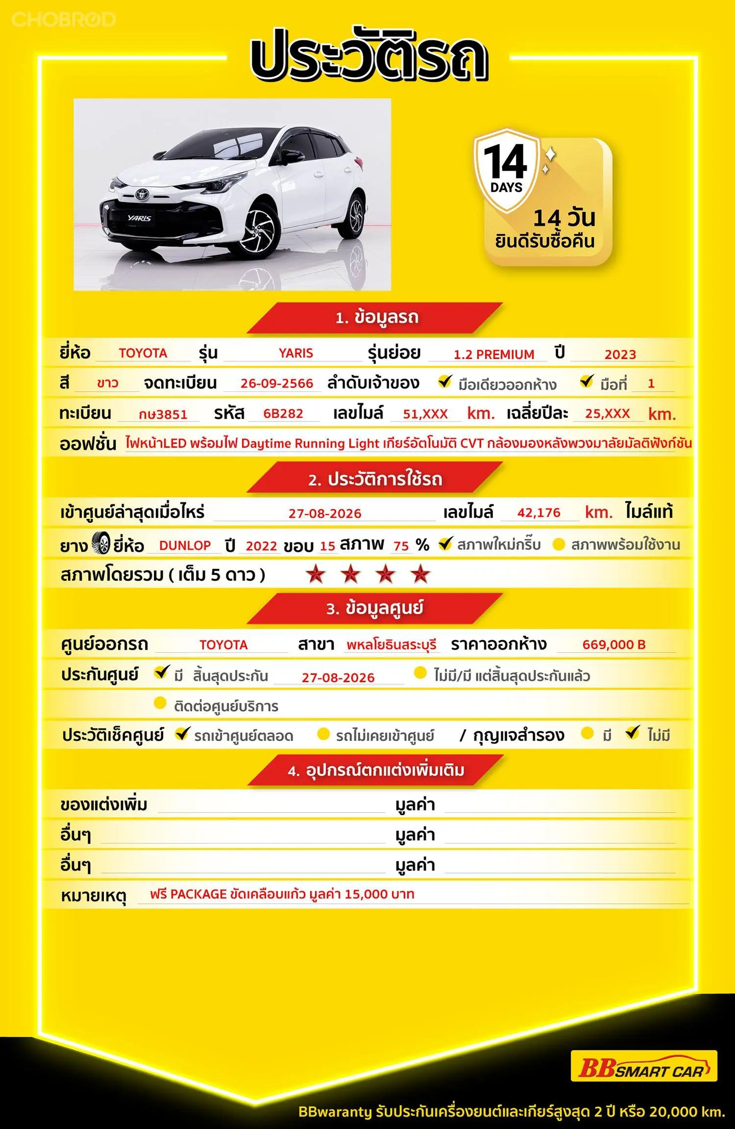 TOYOTA YARIS 1.2 PREMIUM AT 2023 ออกรถ 0 บาท จัดได้ 519,000 บ. Line:@**********แสดงข้อมูล 🔥จอง 199 บาท ส่งบัตรประชาชน รู้ผลพิจารณาภายใน 30 นาที ไม่ผ่านคืนเงินจองทุกกรณี 🔥ซื้อรถกับ BB พร้อมให้คำปรึกษา แก้ทุกปัญหา ให้ทุกเรื่อง บริการ call center 24 ชม. 🔥BB Care Plus รับประกันหลังการขาย สูงสุด 2 ปี หรือ 20,000 km.. 🔥มีรถให้เลือกมากกว่า 1,800 คัน สาขา 6 ศูนย์รวมรถยนต์ไอคาร์สยาม กาญจนาภิเษก รหัสรถ 6B282 ราคา 499,000 บาท ผ่อนเพียง 8,856 บาท Brand. : TOYOTA Year. : 2023 Model. : YARIS ECO Grade. :1.2 PREMIUM Engine. : 1,200 CC Type. : เบนซิน Gearbox : AT Color. : ขาว Mileage. : 51,xxx KM. (ซื้อสด ราคานี้ยังไม่รวมค่าดำเนินการ 10,000 บ.) 🚩 Price. 499,000 บาท ยอดจัด : 509,000 บาท เงินดาวน์ : 0 บาท ประกันภัย : ฟรีประกันภัย 1 ปี ค่าดำเนินการ : 10,000 บาท รวมออกรถ : 0 บาท ผ่อน 36 = 17,039 บาท ผ่อน 48 = 13,109 บาท ผ่อน 60 = 10,892 บาท ผ่อน 72 = 9,743 บาท ผ่อน 84 = 8,856 บาท เงื่อนไขเป็นไปตามที่ไฟแนนซ์กำหนด โปรโมชั่นพิเศษ สำหรับลูกค้าเครดิตดี 🚩เลือกรับเรทดอกเบี้ยพิเศษ 📍36 งวด = 1.29 % 📍48 งวด = 1.99 % 📍60 งวด = 2.39 % 📍72 งวด = 3.59 % 🔥 เงื่อนไข โปรโมชั่น ดอกเบี้ยเริ่มต้น 1.29% ตลอดอายุสัญญา - ยอดจัดไฟแนนซ์ 300,000-600,0000 บาท - ผ่อนสูงสุด 72 เดือน - เป็นลูกค้าประวัติดี พนักงานประจำเงินเดือน 20,000 ขึ้นไป - ค่าดำเนินการแคมเปญ 20,000 บาท (รวมในยอดจัดได้) 🎗Car Hightlight รถสวยๆ วันนี้ขอแนะนำ TOYOTA YARIS 1.2 PREMIUM AT 2023 ออฟชั่น 12.2.1 : มี Toyota Safety Sense (ระบบช่วยขับขี่ / ระบบความปลอดภัยขั้นสูง) 12.2.2 : ไฟหน้า LED พร้อมไฟ Daytime Running Light 12.2.3 : เกียร์อัตโนมัติ CVT พร้อมเครื่องยนต์ 1.2 ลิตร 🎗ภายใน จอ LCD เล่น DVD แอร์ AUTO เซ็นทรัลล๊อก Airbag พวงมาลัย Multifunction กระจกมองข้างปรับไฟฟ้า เบาะหนัง พวงมาลัยเพาเวอร์ 🎗ภายนอก กระจกไฟฟ้า เบรค ABS คิ้วกันสาด ล้อแม็ก ไฟโปรเจคเตอร์ ไฟเลี้ยวกระจกมองข้าง 🎗ความคุ้มค่า สำหรับคันนี้หากเปรียบเทียบราคากับคุณภาพ คันนี้ถือว่าคุ้มค่ามากค่ะ ผ่อนสบายๆก็มีรถขับได้ รถดีมีคุณภาพแบบนี้รีบตัดสินใจซื้อได้เลราคานี้มาไวไปไวนะคะ ⭐️การรับประกันหลังการขาย BB Care Plus สูงสุด 2 ปี หรือ 20,000 km. ด้วยช่างที่ผ่านการอบรมจากศูนย์ชั้นนำของประเทศ 🎉🎉Special offer เฉพาะ บีบีสมาร์ทคาร์ ที่นี่ที่เดียว ⭐️ ดอกเบี้ยเริ่มต้น 1.29% มีไฟแนนซ์รองรับหลายที่ค่ะ ⭐️ ฟรี!! แพคเก็จ ขัดเคลือบแก้ว มูลค่า 15,000 บาท ทุกคัน ⭐️ อนุมัติไว 30 นาที นำเอกสารมาให้ครบรับรถกลับบ้านทันทีค่ะ ⭐️ BB Care Plus รับประกันหลังการขาย สูงสุด 2 ปี หรือ 20,000 km. ⭐️ มี 6 สาขา ในกรุงเทพและปริมณฑลใกล้บ้านท่าน ⭐️ รถทุกคันผ่านตรวจสอบ Inspection เรียบแล้วค่ะ ผ่าน 5 ดาวทุกคันค่ะ ⭐️ เซลล์ทุกท่านเป็นมืออาชีพพร้อมให้บริการทุกท่านแน่นอนค่ะ