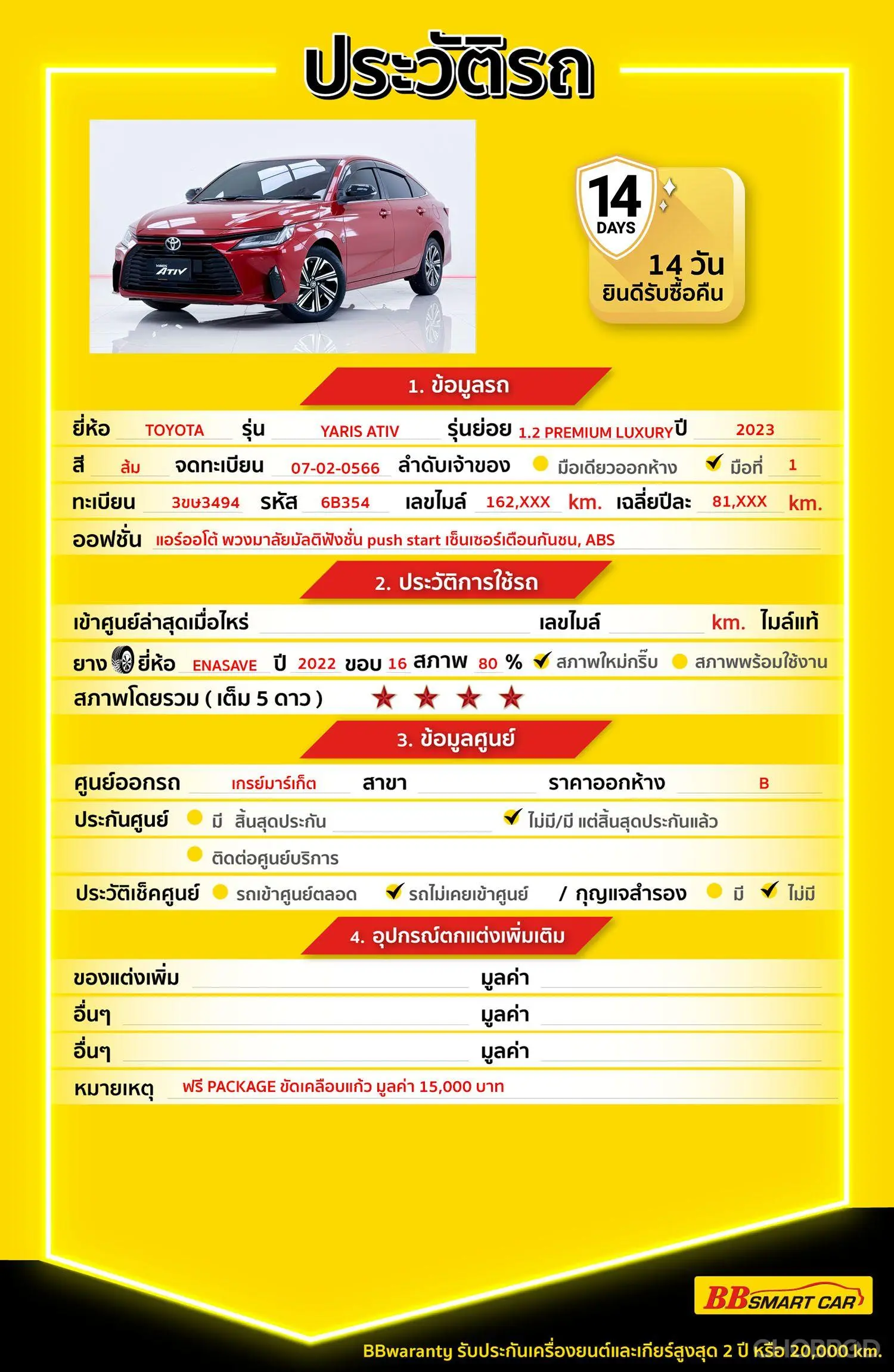 มีการรับประกันจากดีลเลอร์ (6 เดือน) มีบริการช่วยเหลือฉุกเฉินบนท้องถนน 24 ชม. จากดีลเลอร์